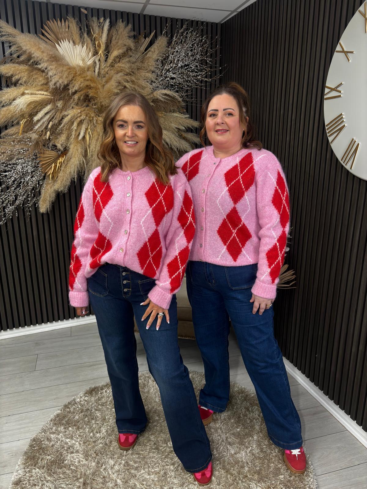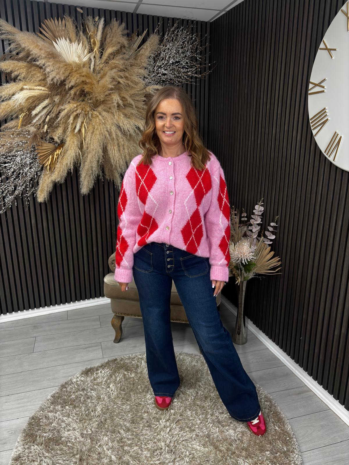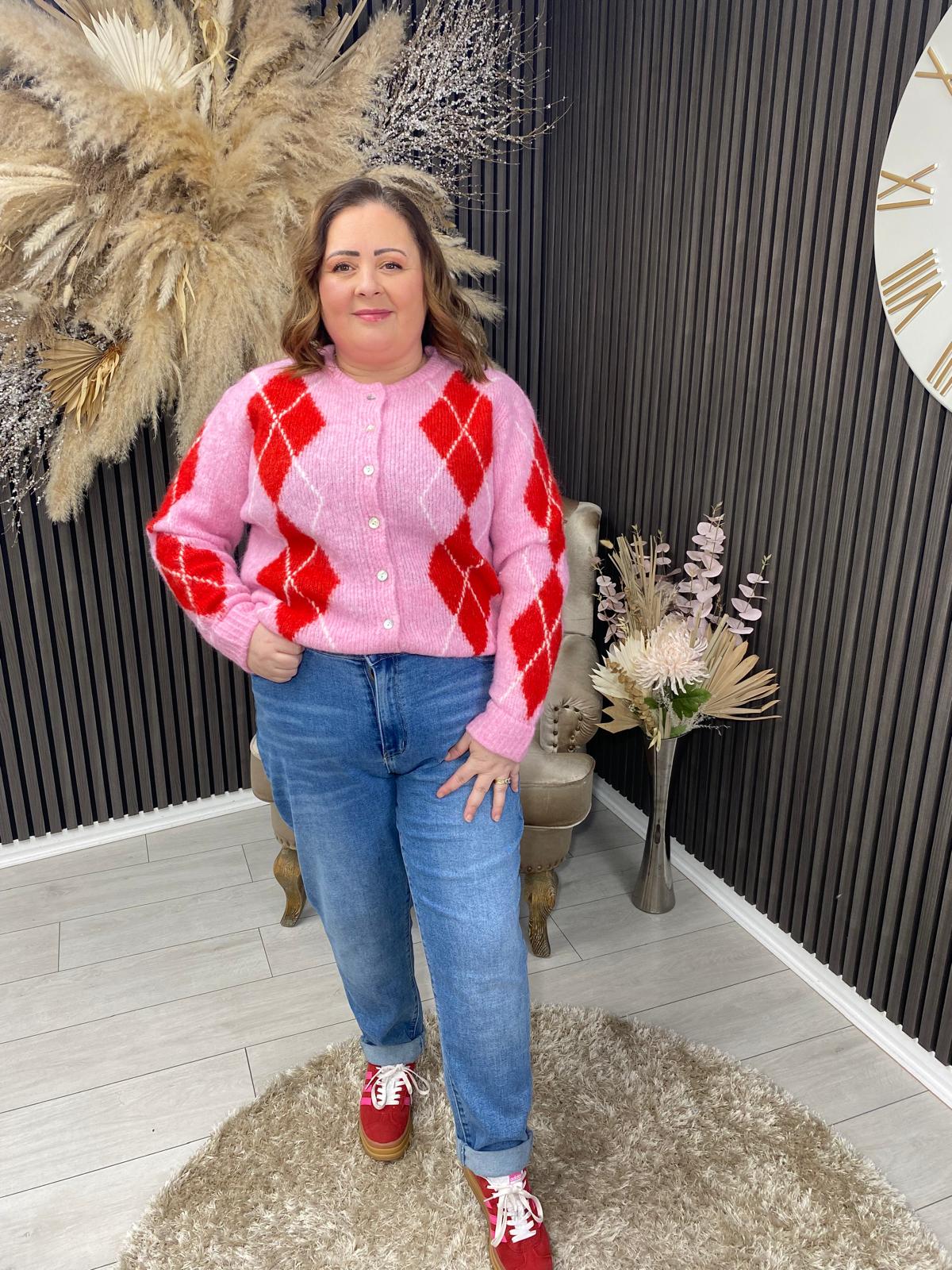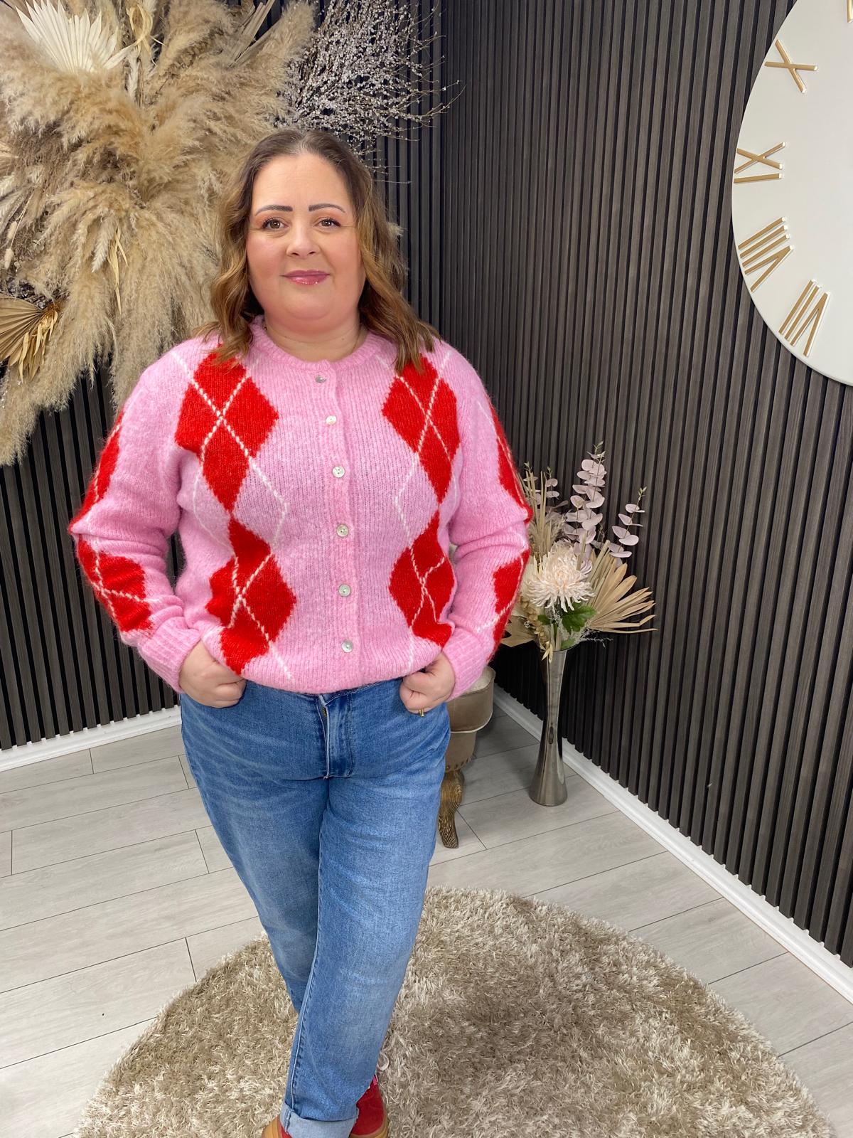 This striking cardigan features a bold diamond pattern in contrasting pink and red tones, crafted with a classic button-front closure. A versatile layering piece that brings geometric interest and colour to any wardrobe.