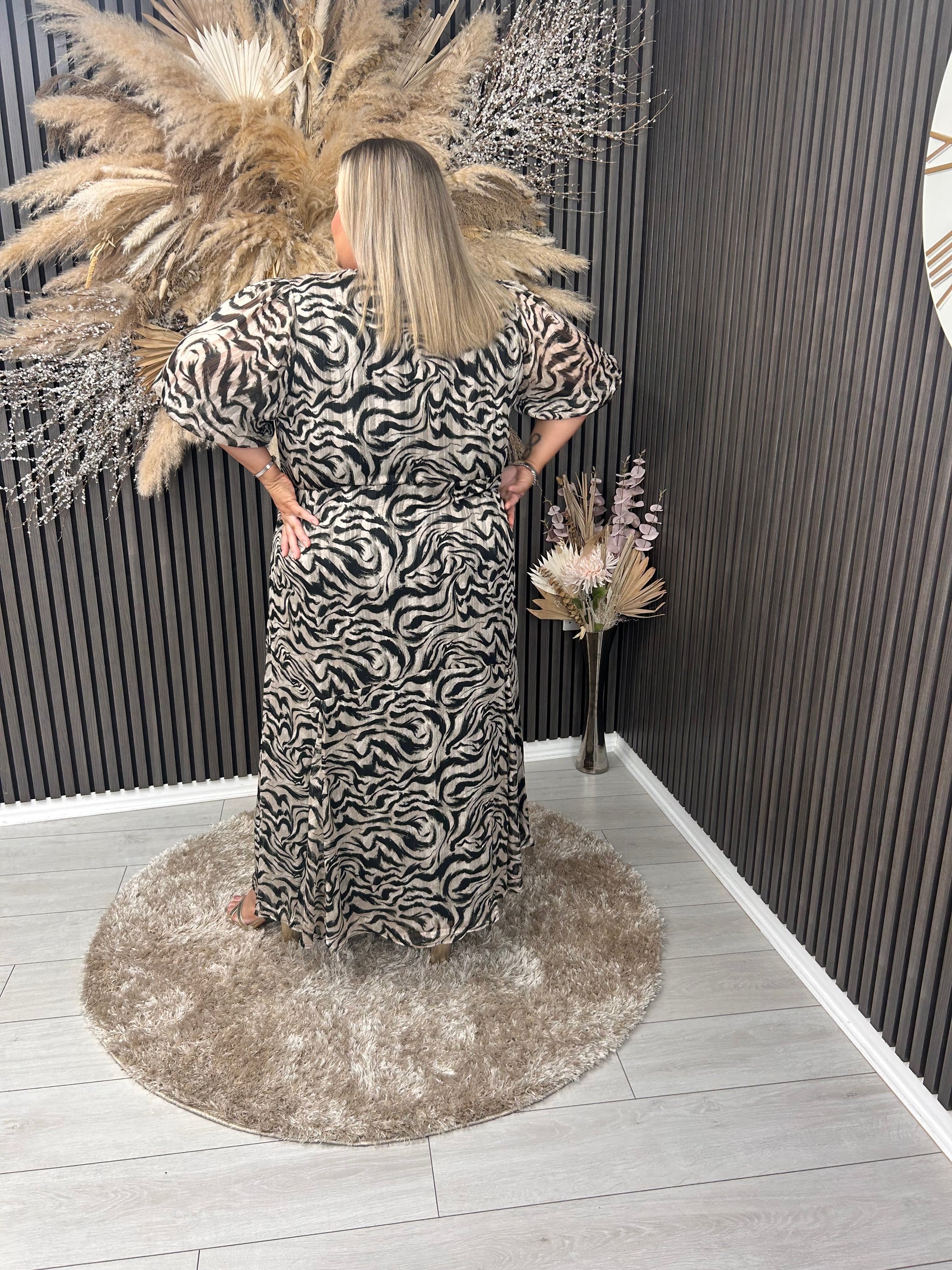Designed to effortlessly transition from daytime outings to evening soirées. Crafted from breathable two-tone fabric adorned with an elegant animal print and delicate gold thread detailing while the faux wrap bodice features puffed sleeves and a timeless V neckline. Its elasticated waist creates a relaxed silhouette and a flowy godet skirt adds extra movement to each step. Whether you're planning a romantic dinner or a special family gathering pair it with black strappy heels and gold accessories to complete your polished look.