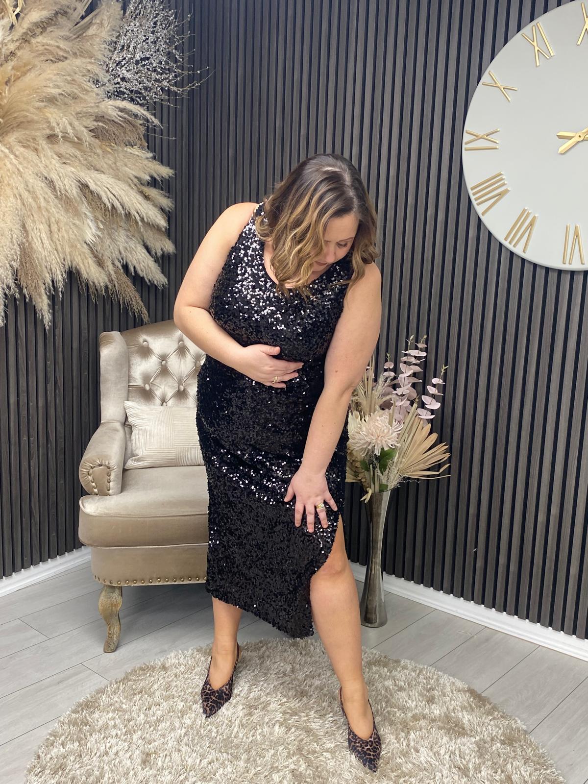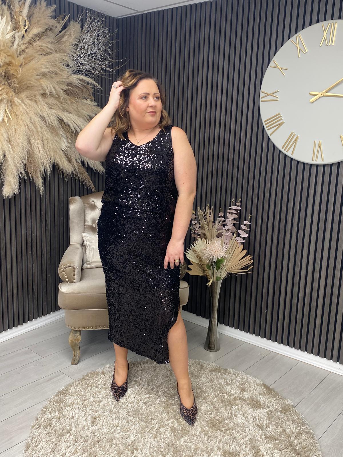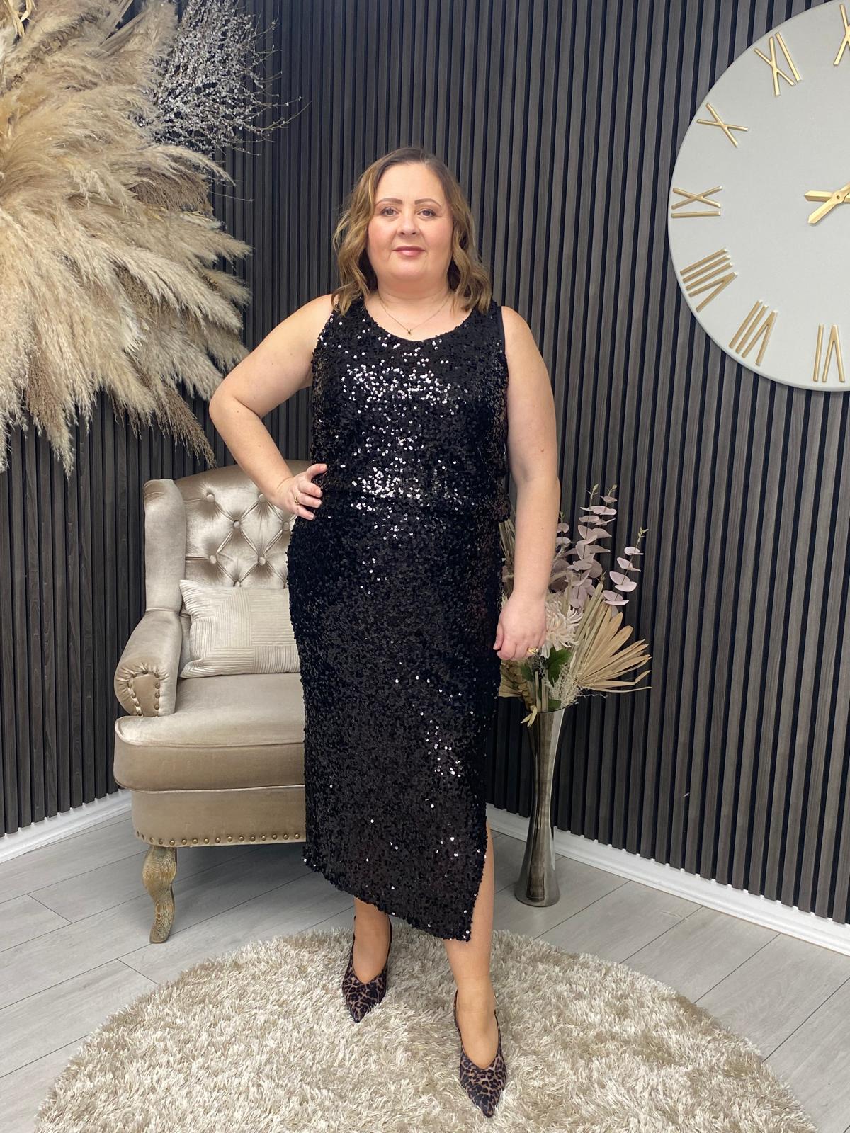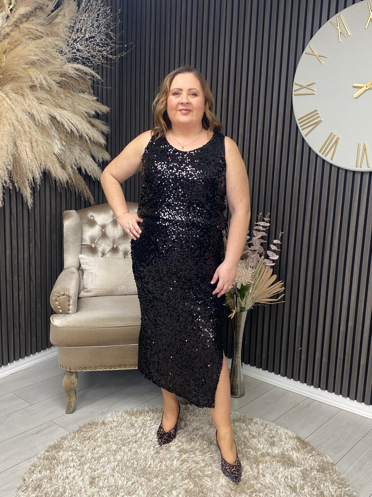 Elegant round-neck vest top adorned with shimmering black sequins for a sophisticated, eye-catching finish. Perfect for adding glamour to evening occasions or special events.