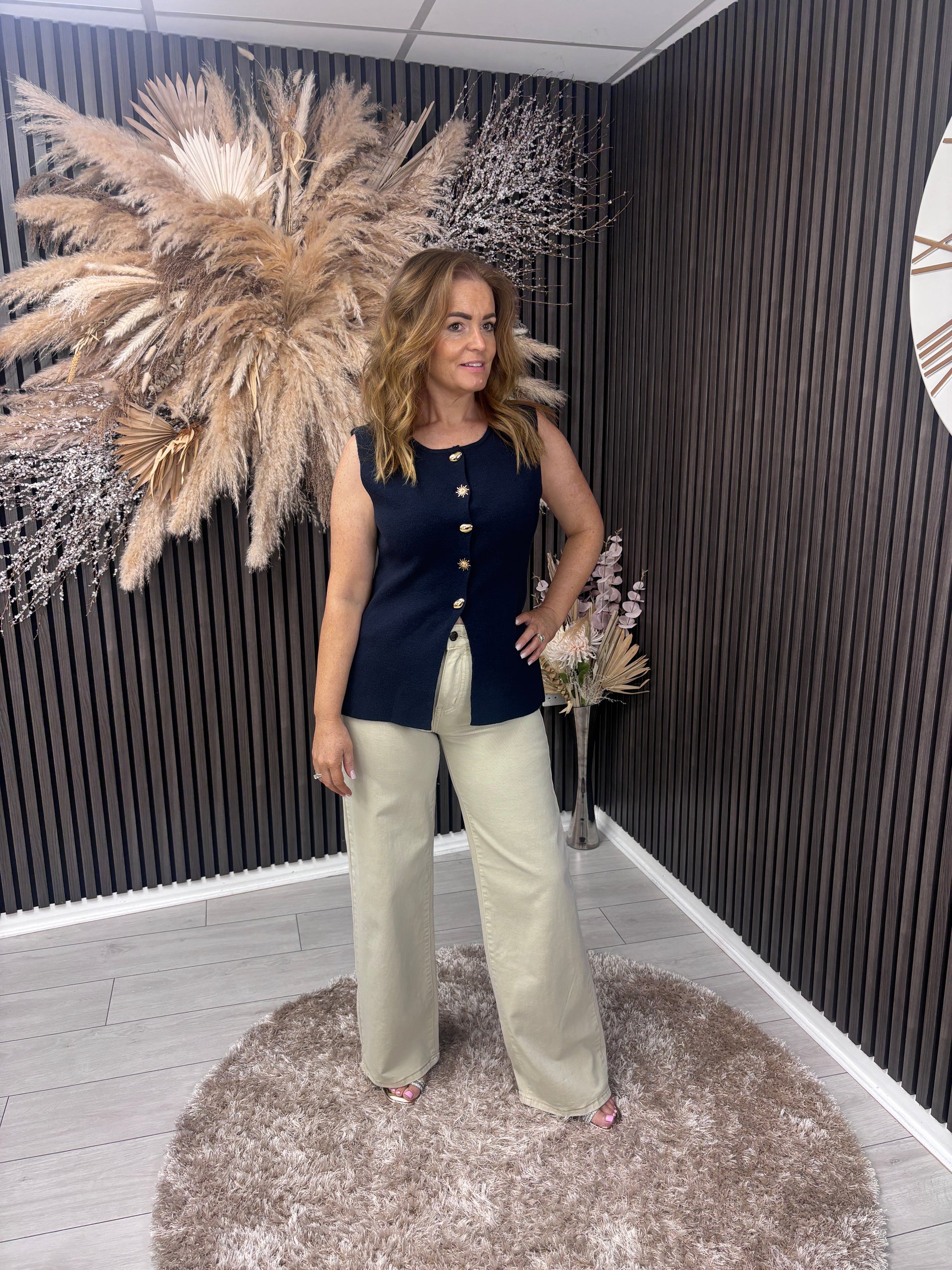This knitted vest features elegant gold buttons, combining classic craftsmanship with refined detailing.