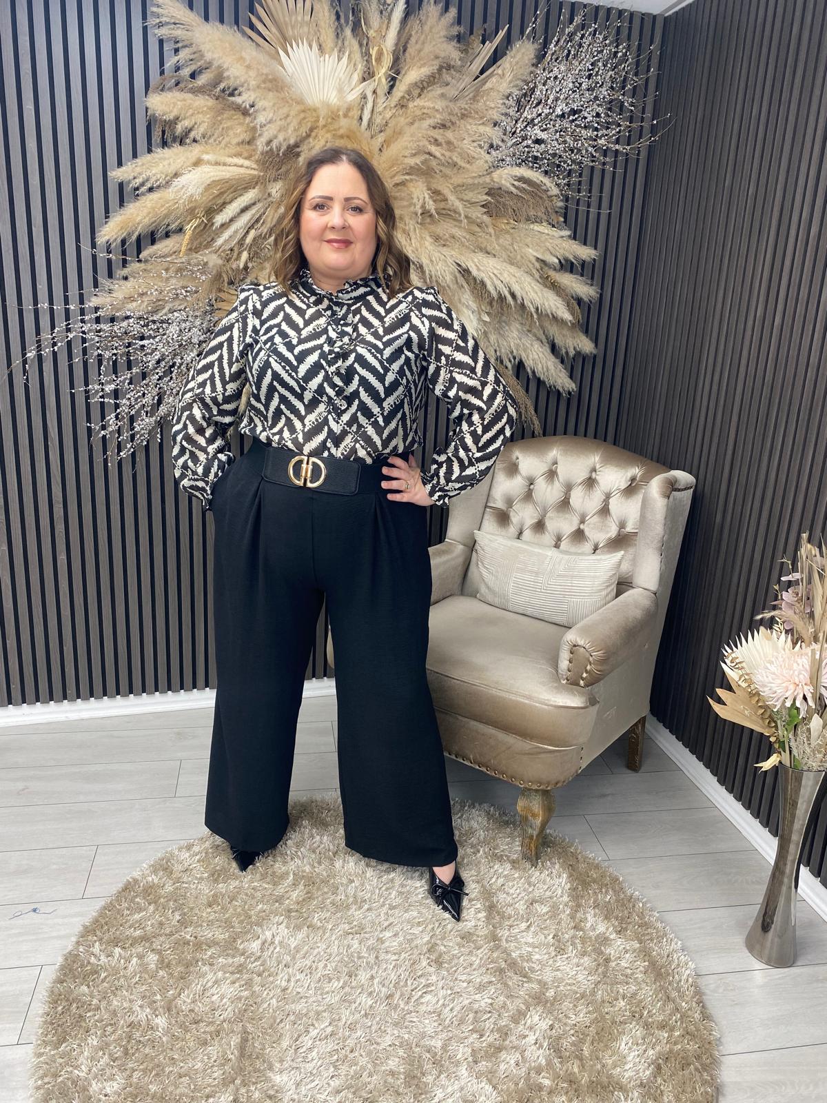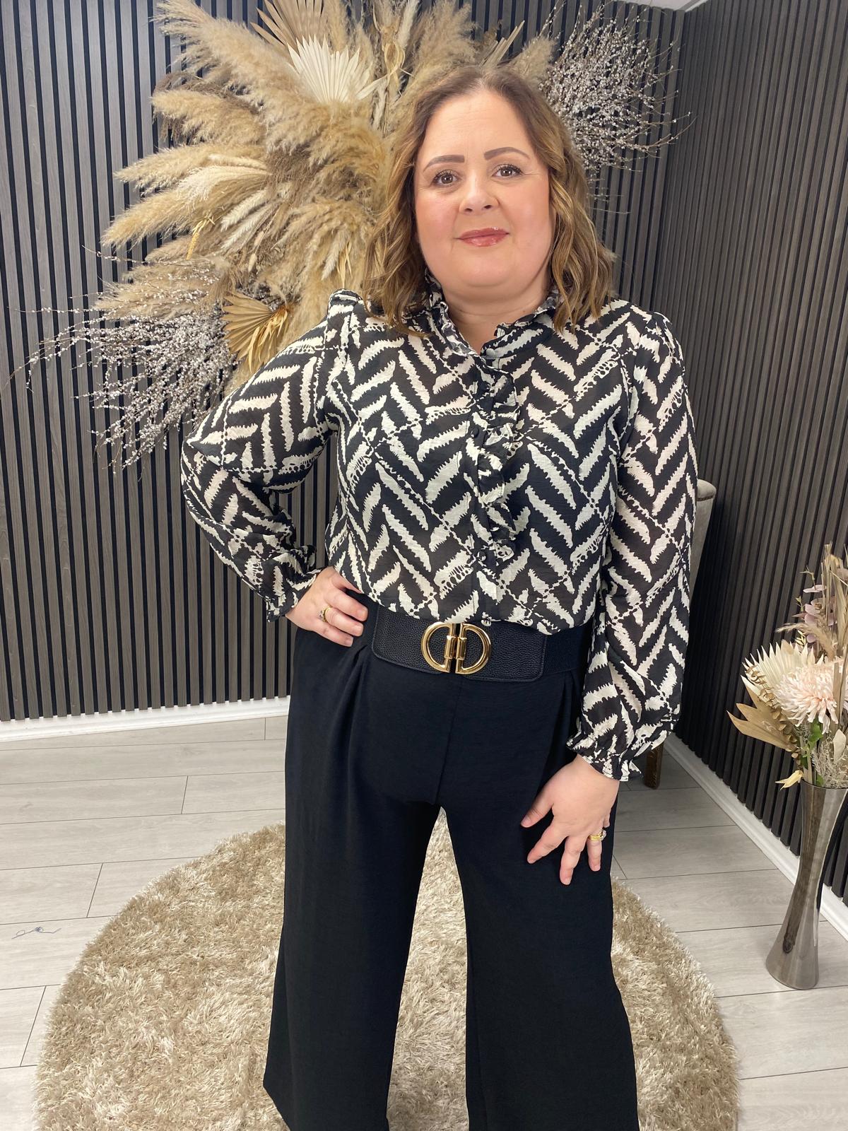 This shirt features a classic black and white design, combining timeless elegance with versatile style.