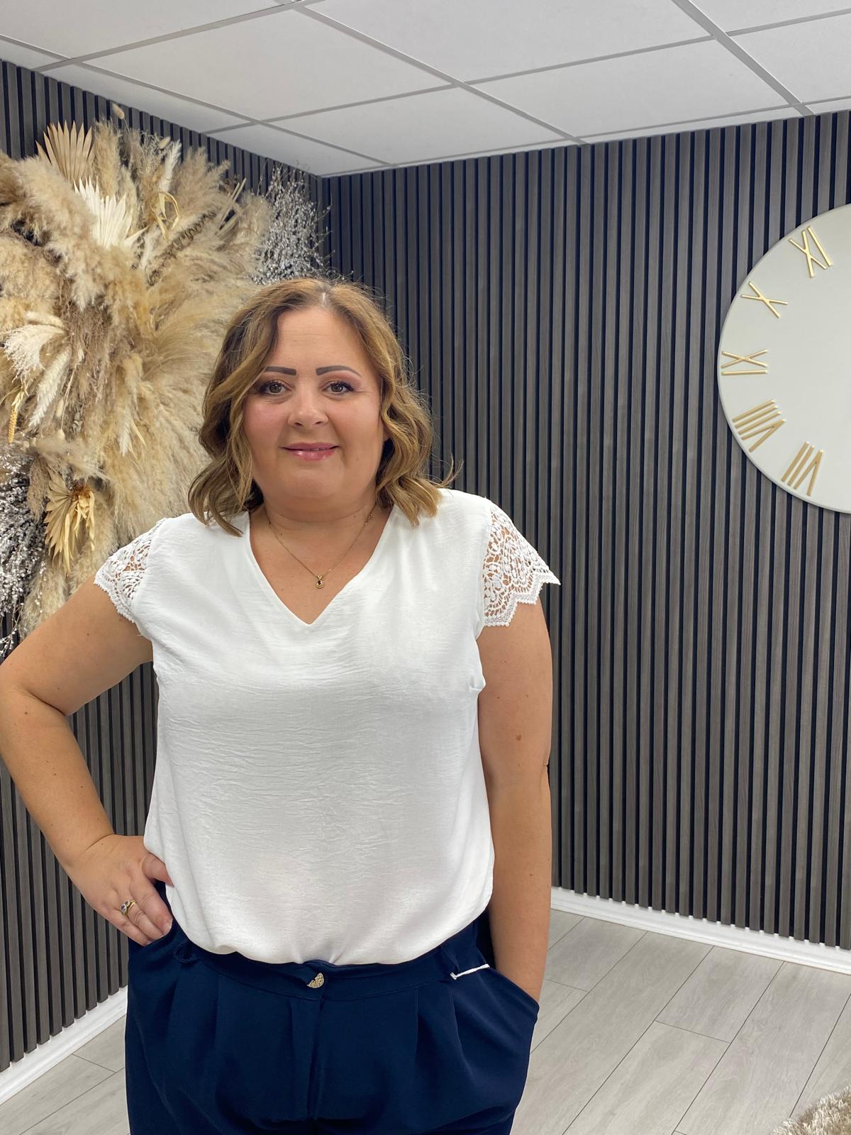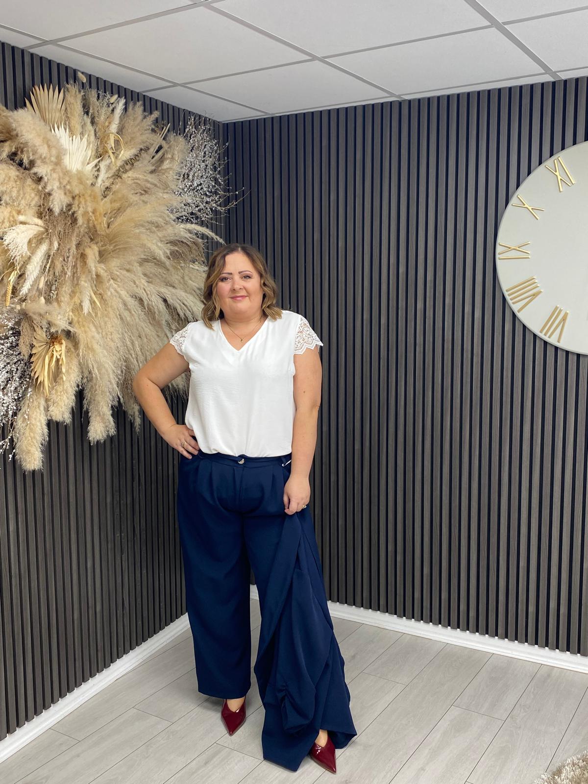 This elegant top features a refined v-neckline and delicate lace detailing on the sleeves.