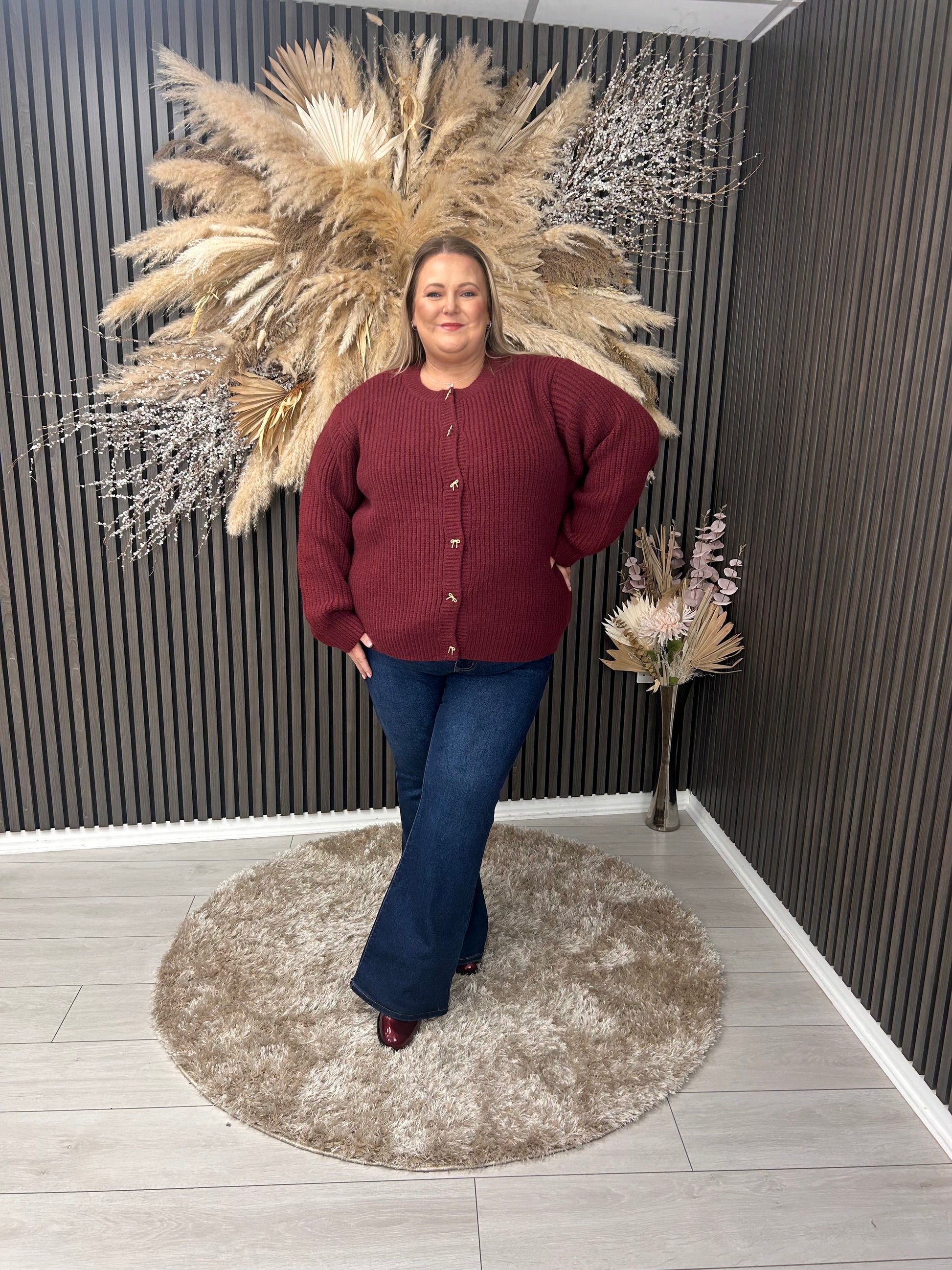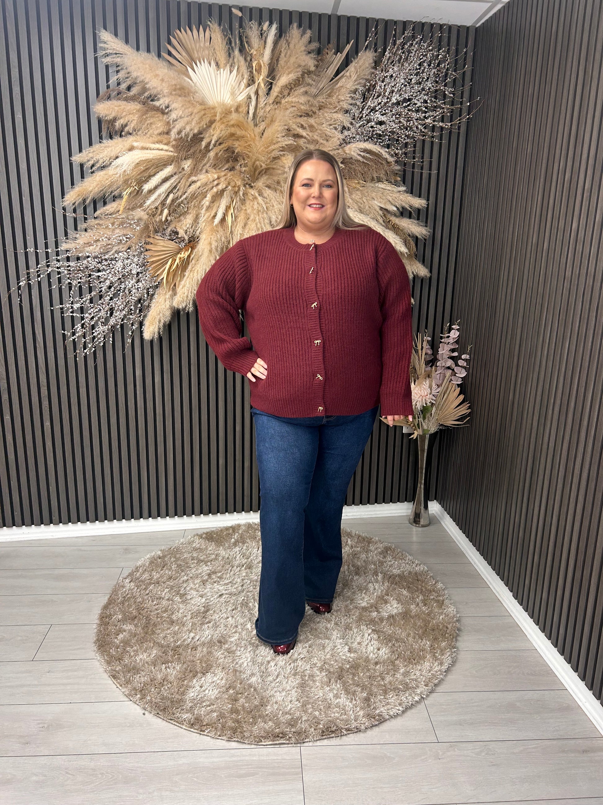Defined by timeless elegance this chunky knit cardigan is a refined addition to any wardrobe. Designed with a classic round neckline the silhouette is elevated by delicate gold bow buttons that lend a feminine touch. The luxurious texture balances charm and comfort in equal measure. For a contemporary twist style with a mini skirt and knee-high boots.