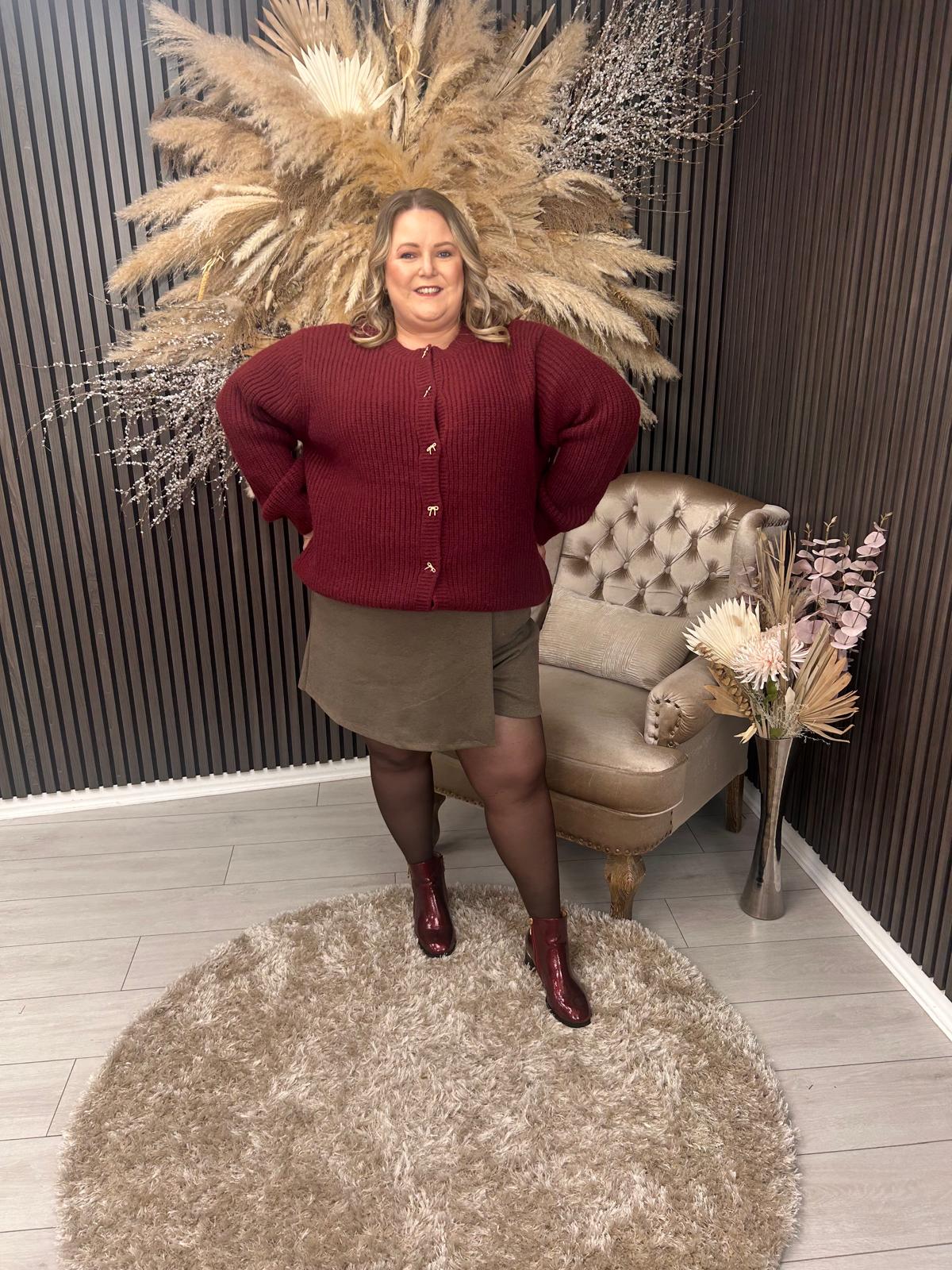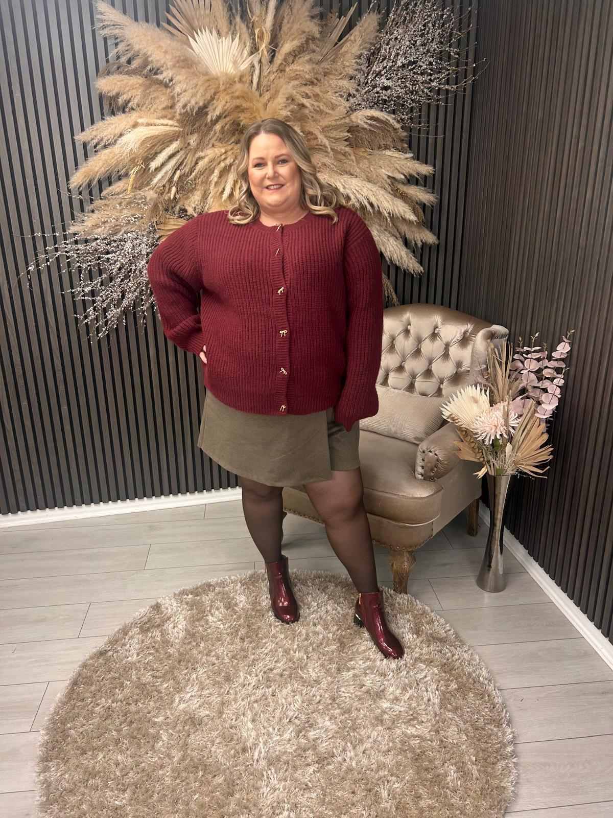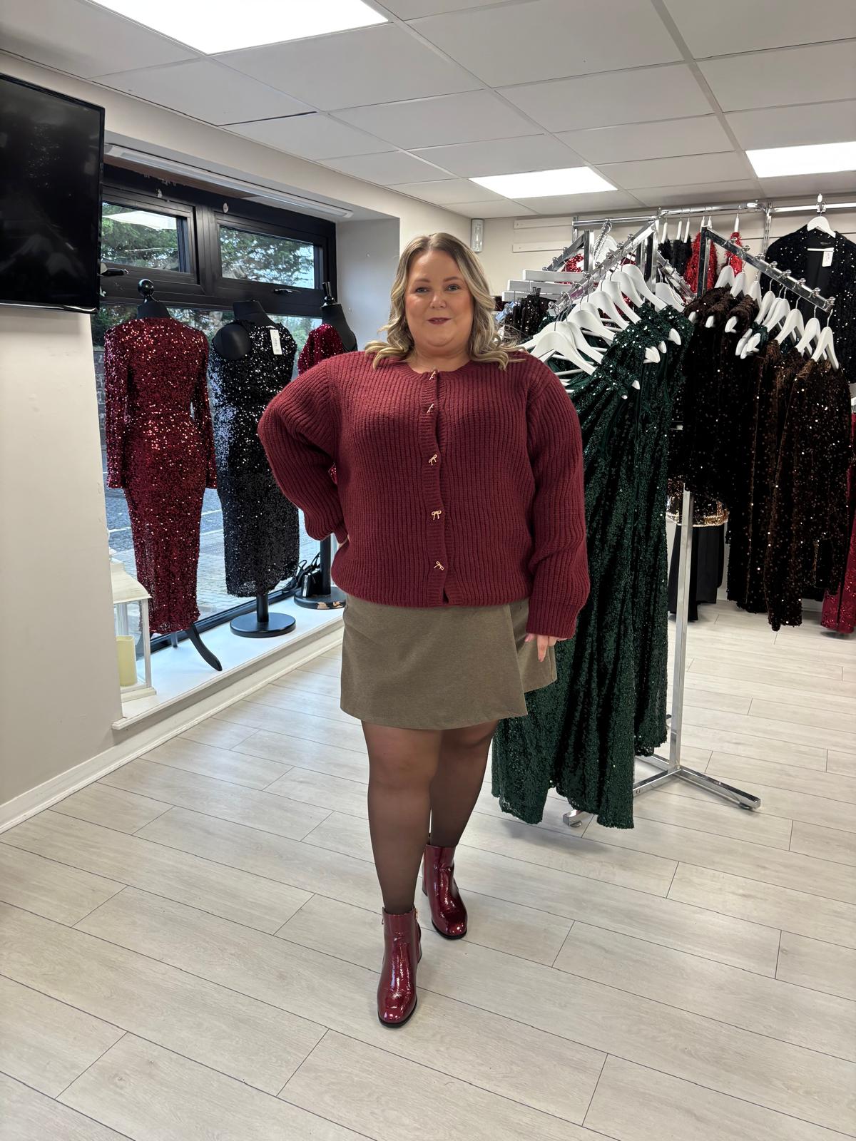 Defined by timeless elegance this chunky knit cardigan is a refined addition to any wardrobe. Designed with a classic round neckline the silhouette is elevated by delicate gold bow buttons that lend a feminine touch. The luxurious texture balances charm and comfort in equal measure. For a contemporary twist style with a mini skirt and knee-high boots.