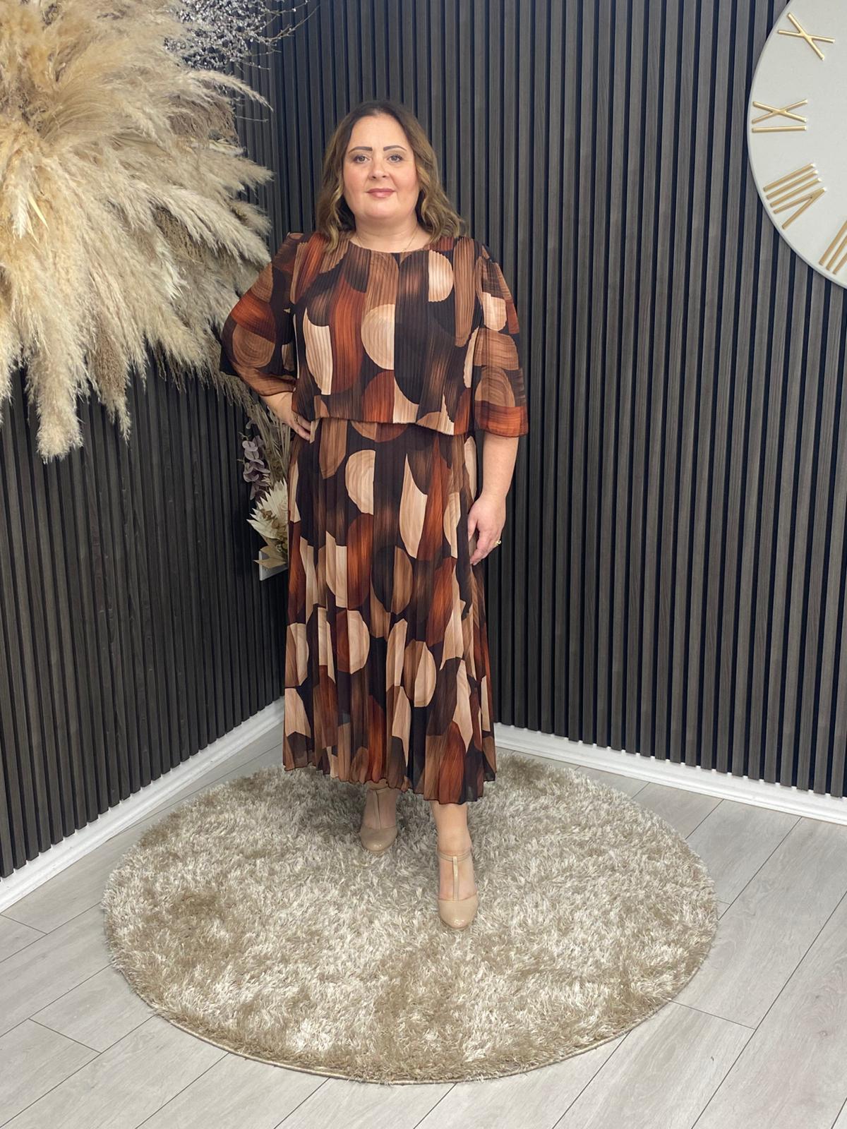 This dress features a blend of brown shades, designed with an overlapping bodice and a pleated skirt for an elegant silhouette.