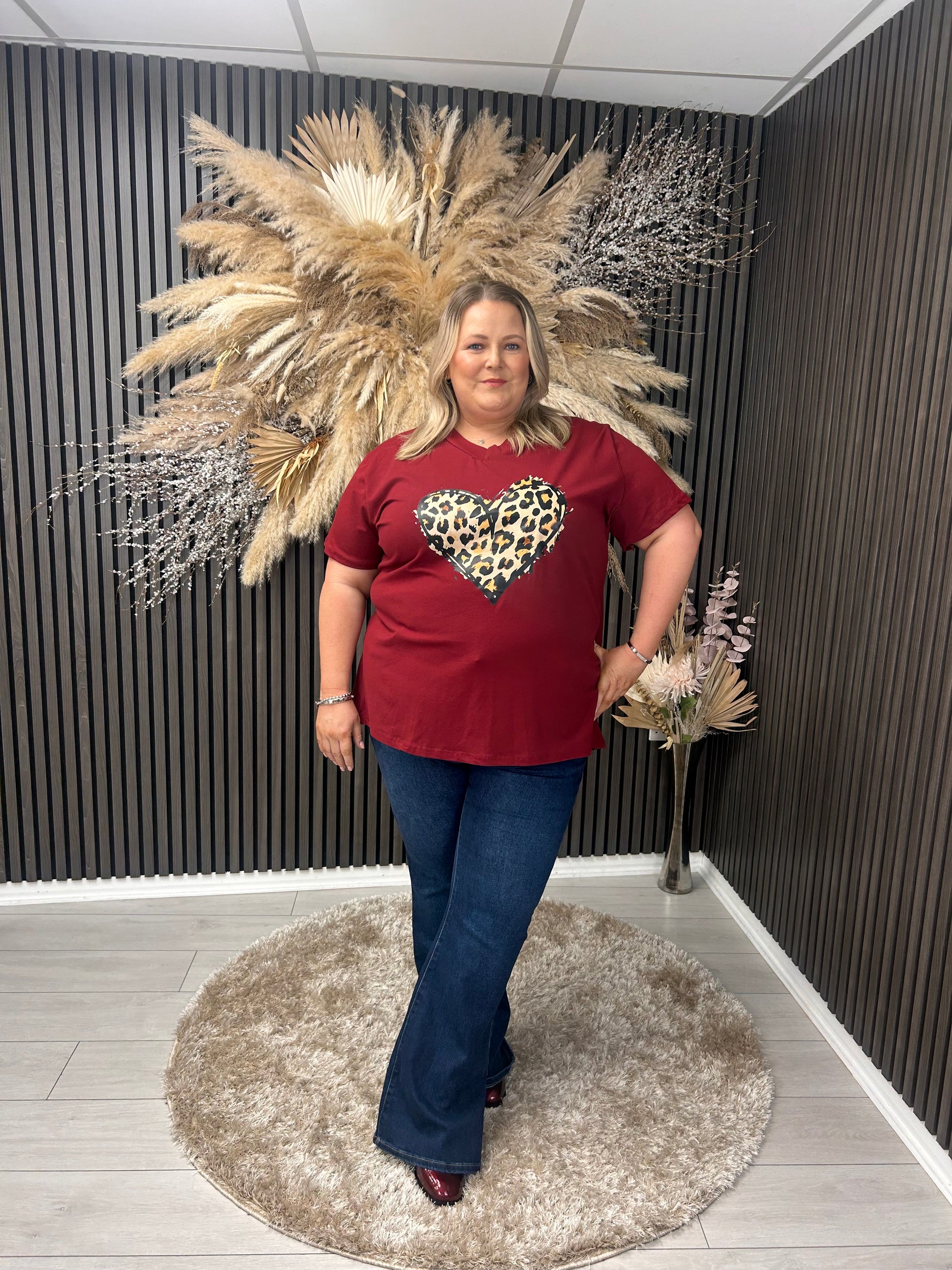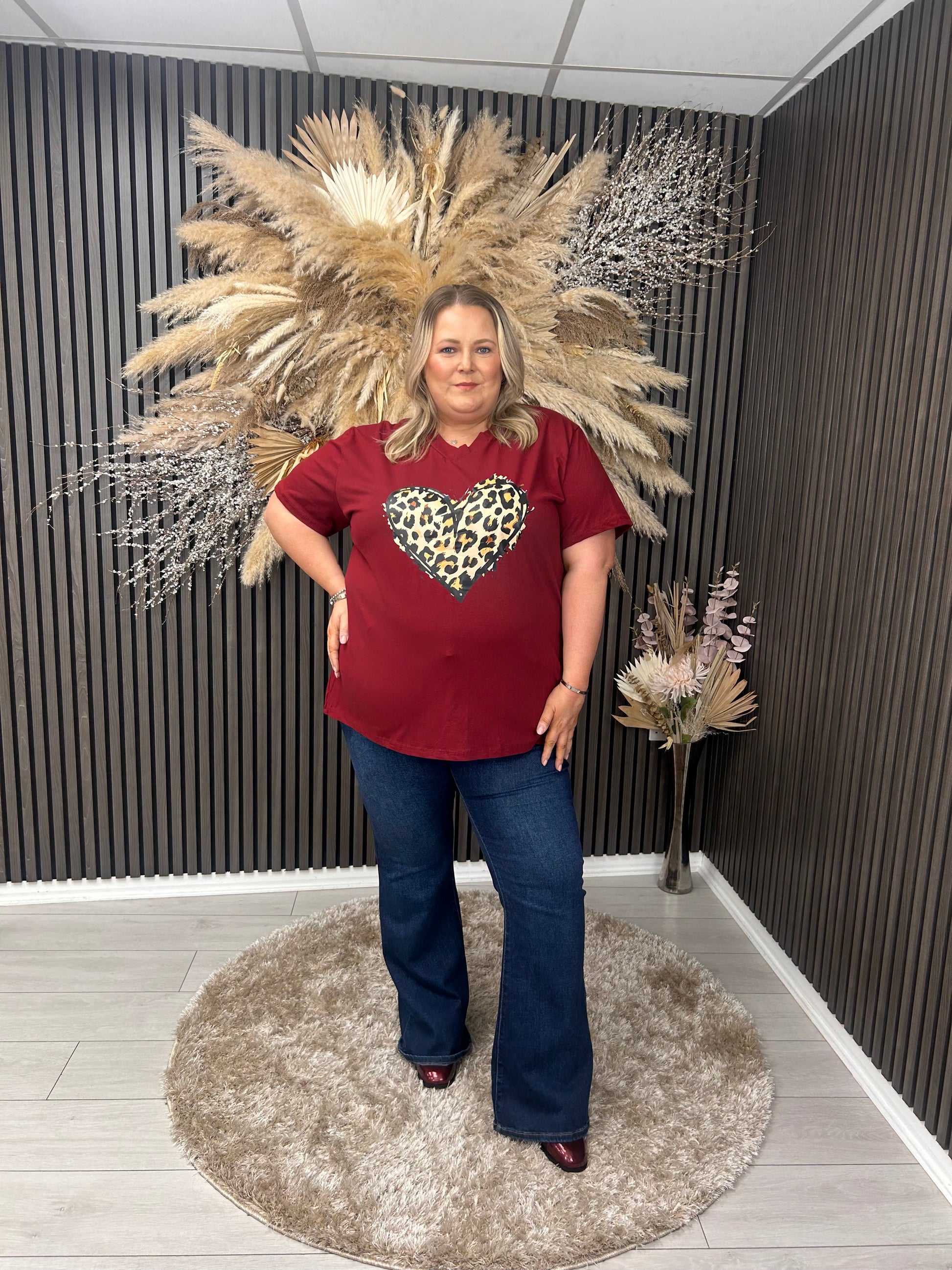 This wine V-neck T-shirt features a stylish heart design embellished with an animal print pattern.
