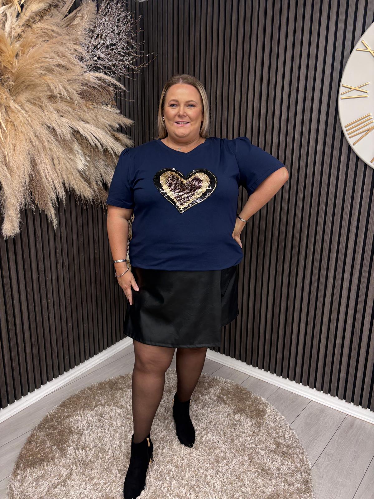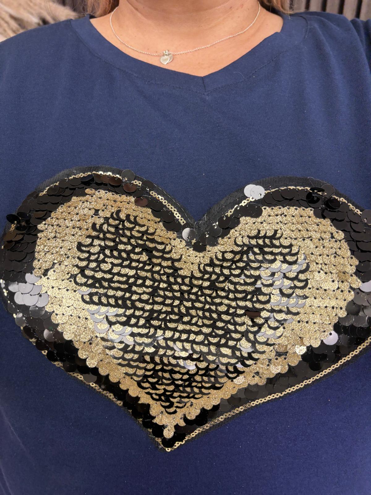 This brown t-shirt features a gold sequince heart design, combining classic style with a subtle touch of sparkle.