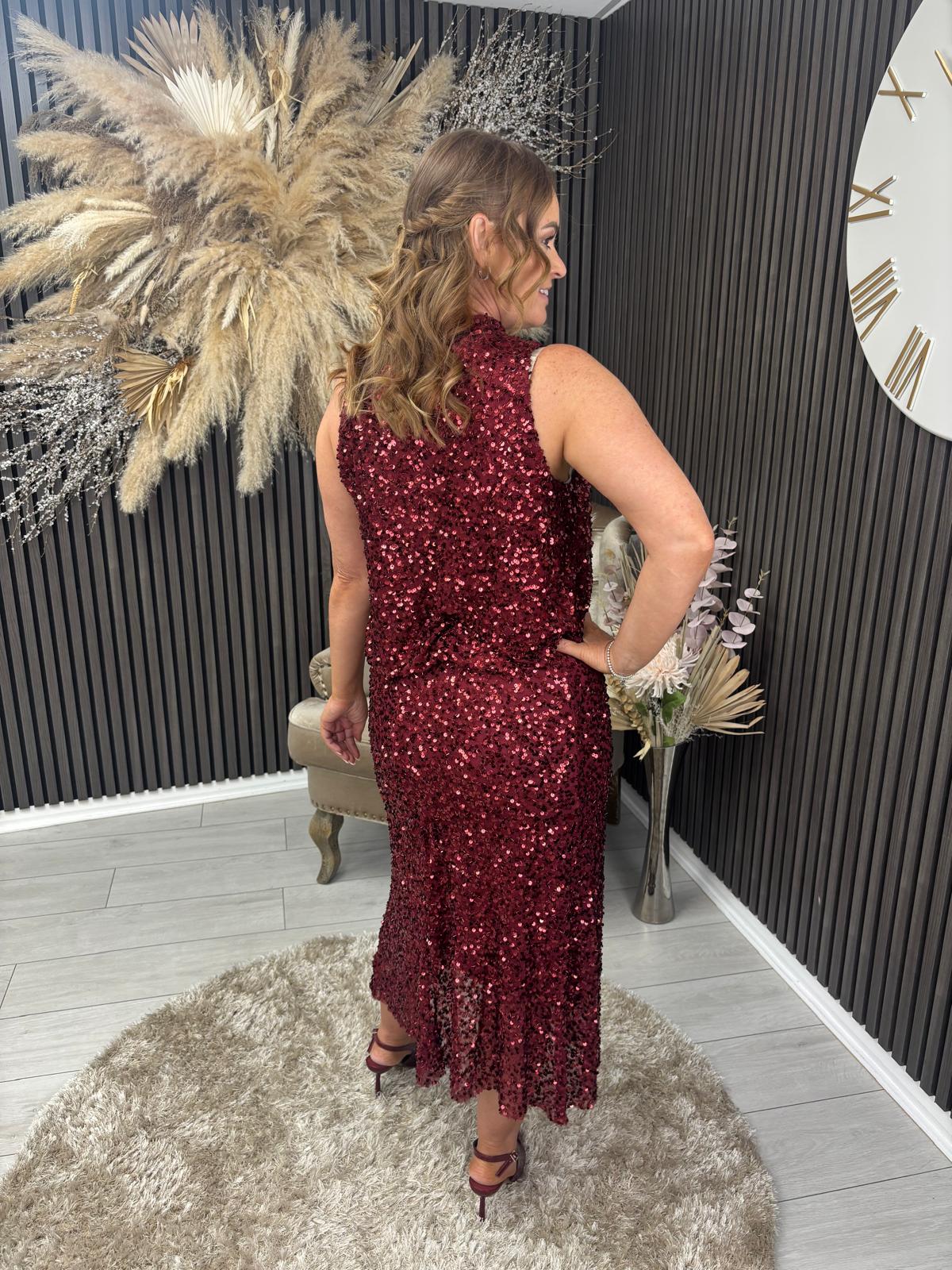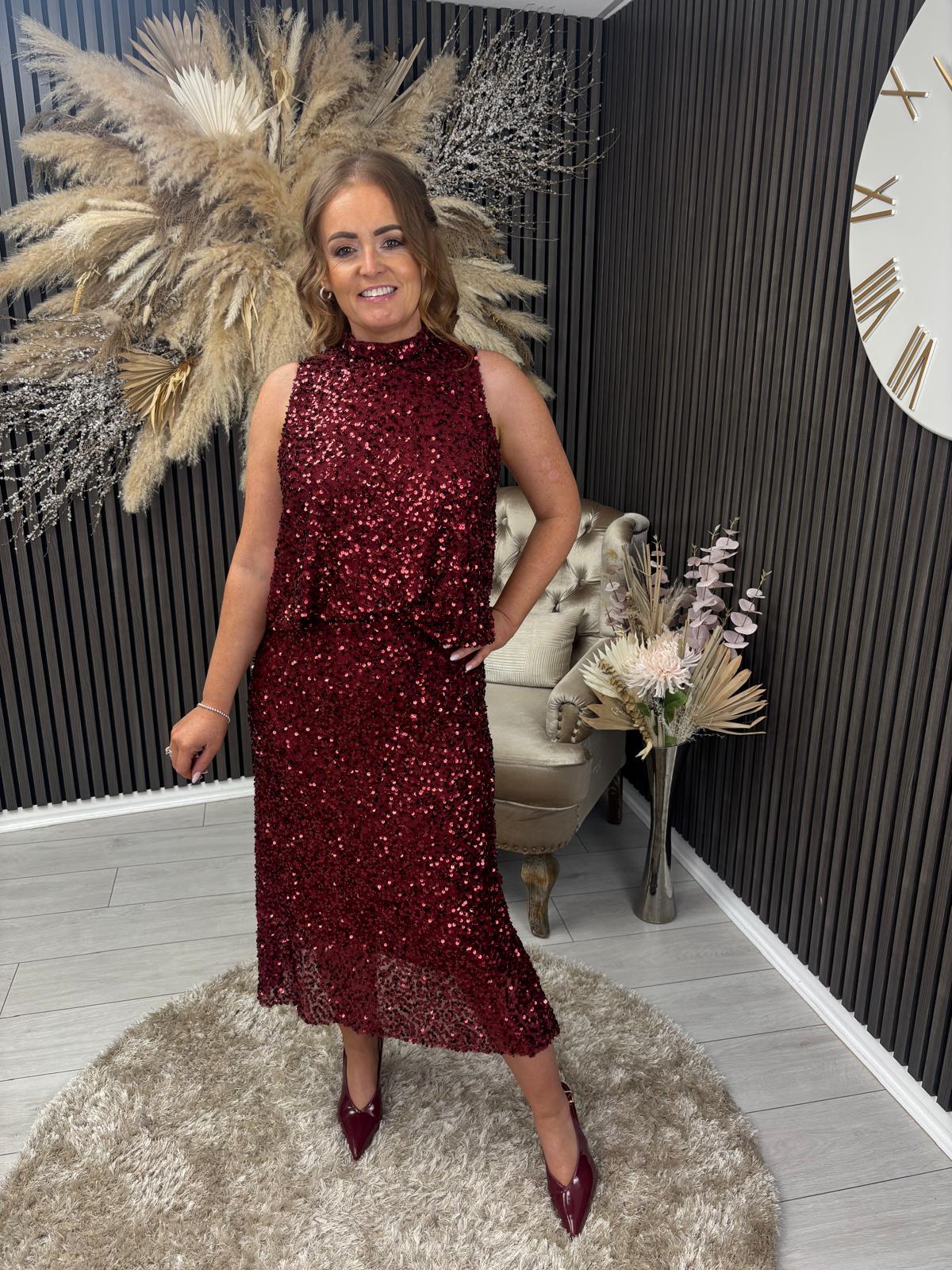 This sophisticated midi skirt features intricate sequin detailing paired with a sumptuous viscose lining that ensures all-day comfort. The thoughtfully designed silhouette flatters a variety of figures, making it an exceptional choice for evening events and celebrations. The rich bordeaux hue adds timeless elegance to any occasion.