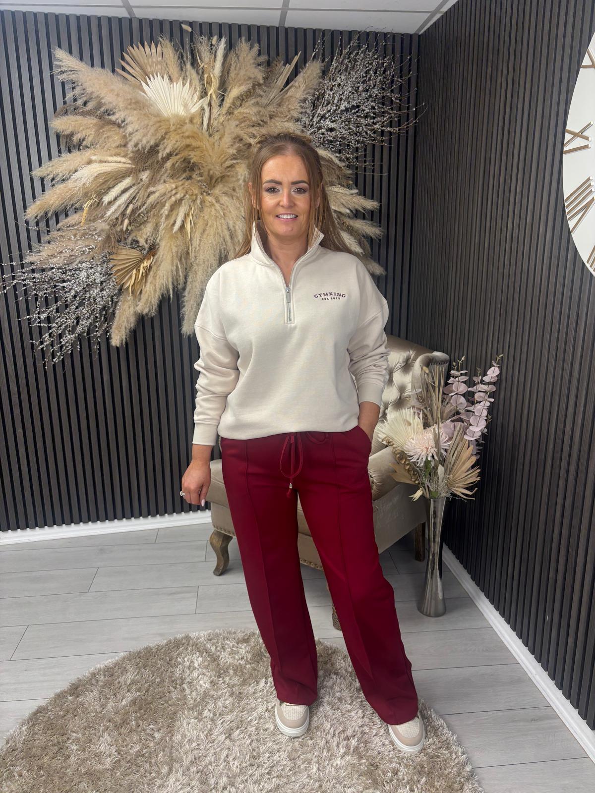 This women's 1/4 zip features a funnel neck and drop shoulder design for a relaxed fit. It includes subtle Gym King embroidery on the front chest and a contrasting arched appliqué logo on the center back. Crafted from soft brushed fleece, it offers comfort and warmth, while elasticated cuffs and hem ensure a secure, tailored finish.
