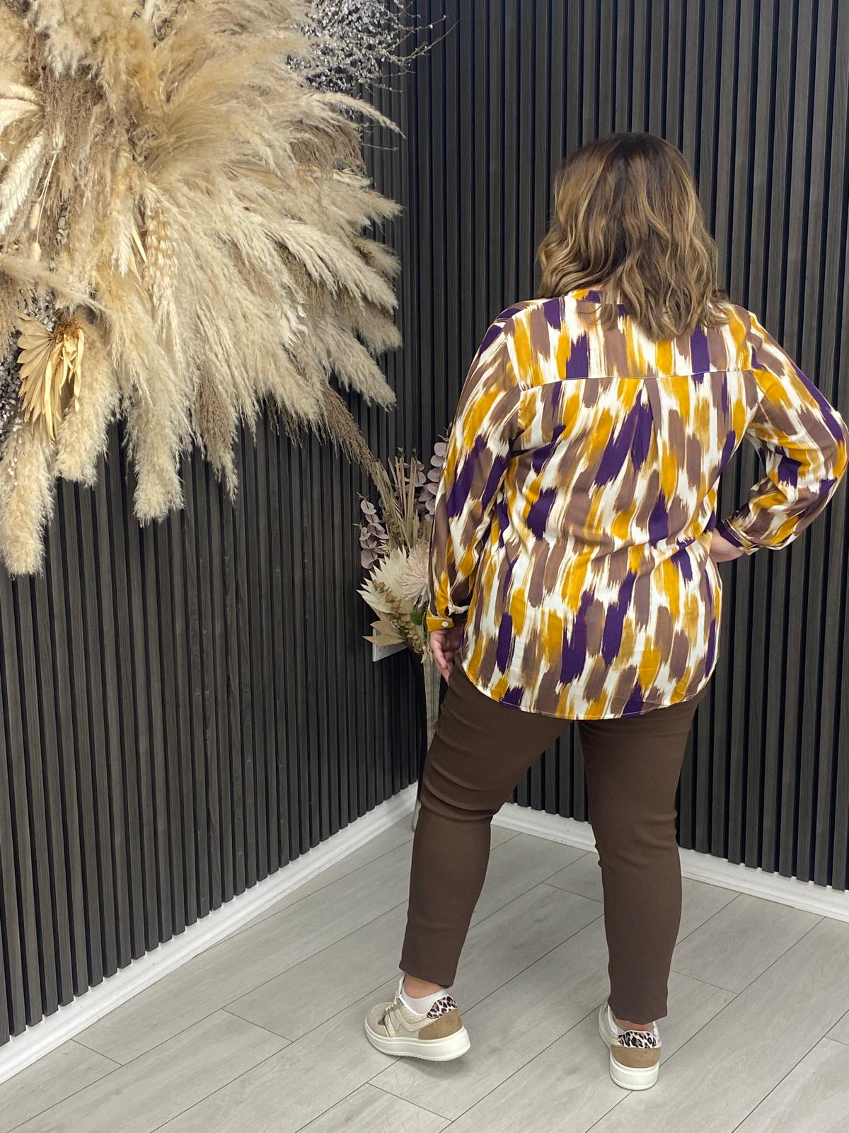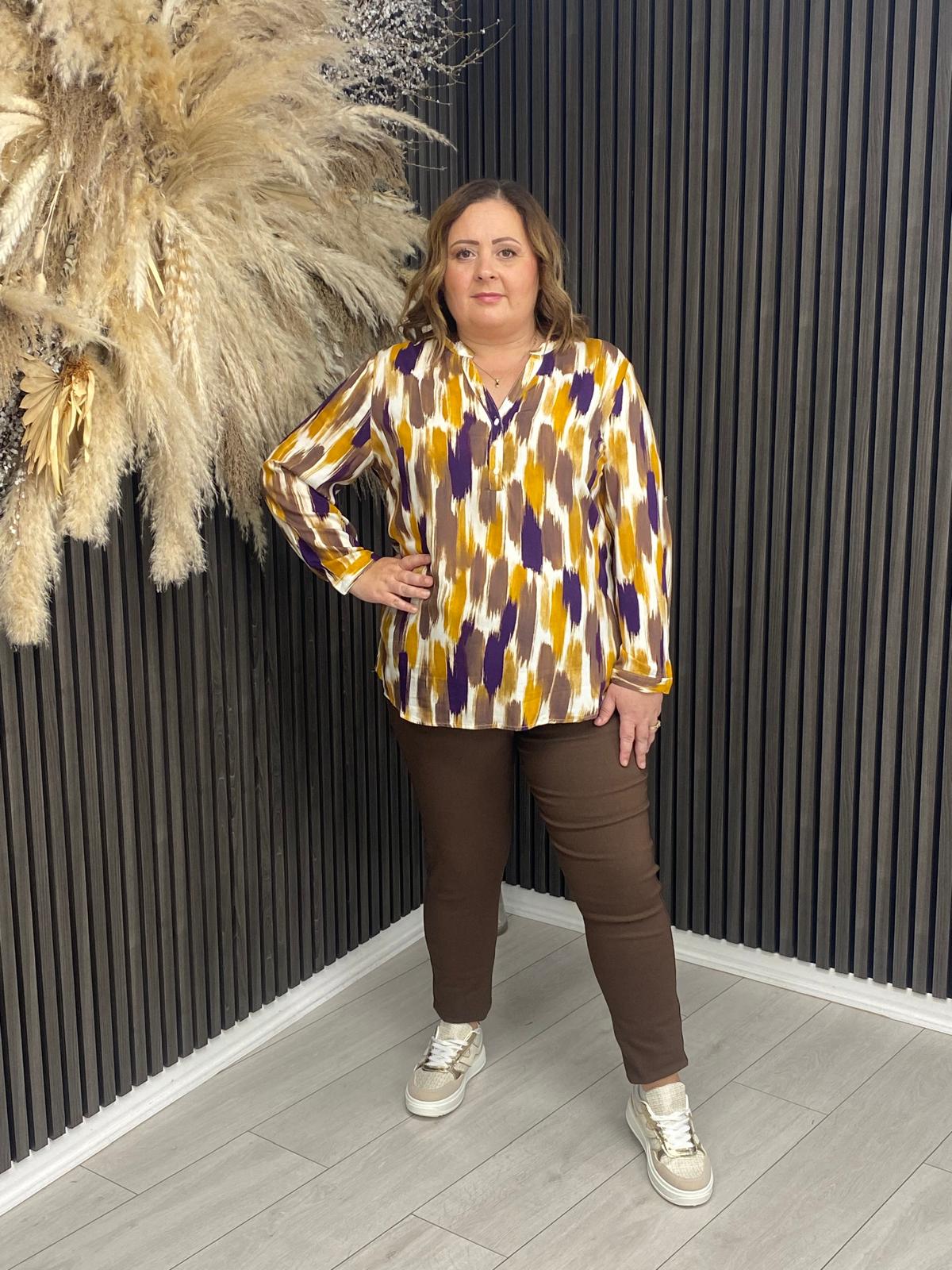 This V-neck top features a sophisticated blend of brown, purple, and yellow hues.