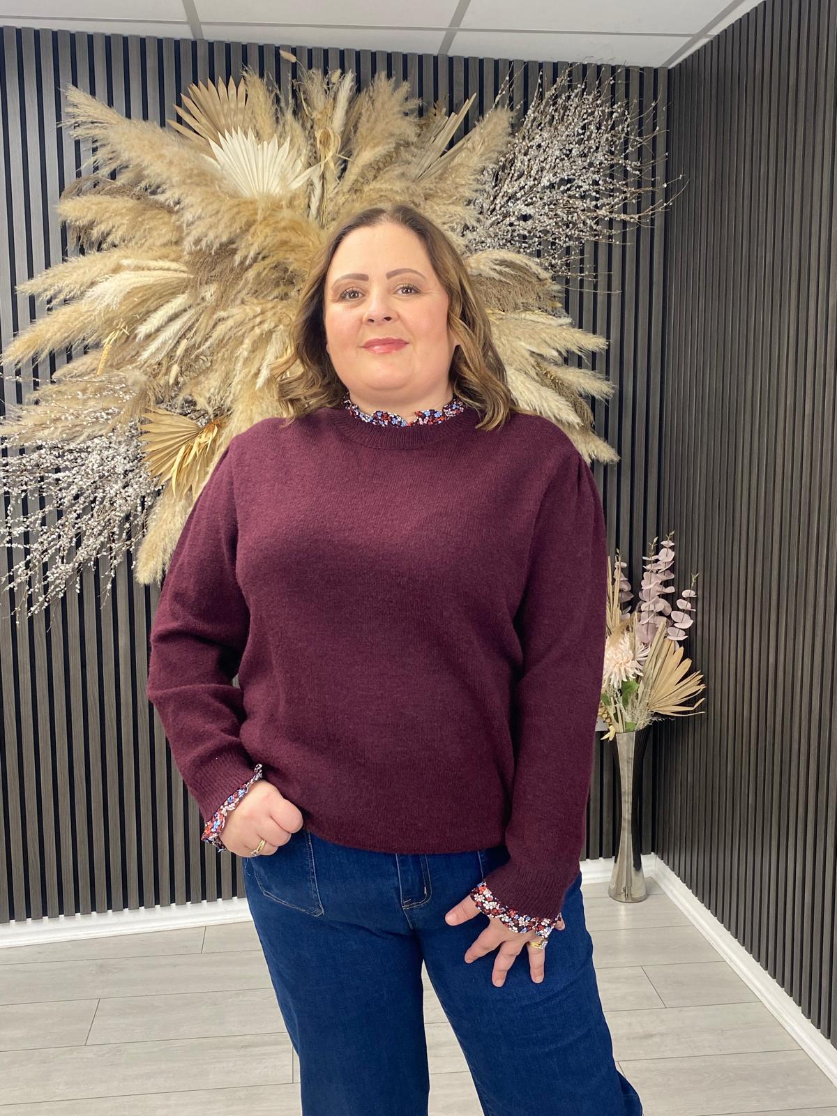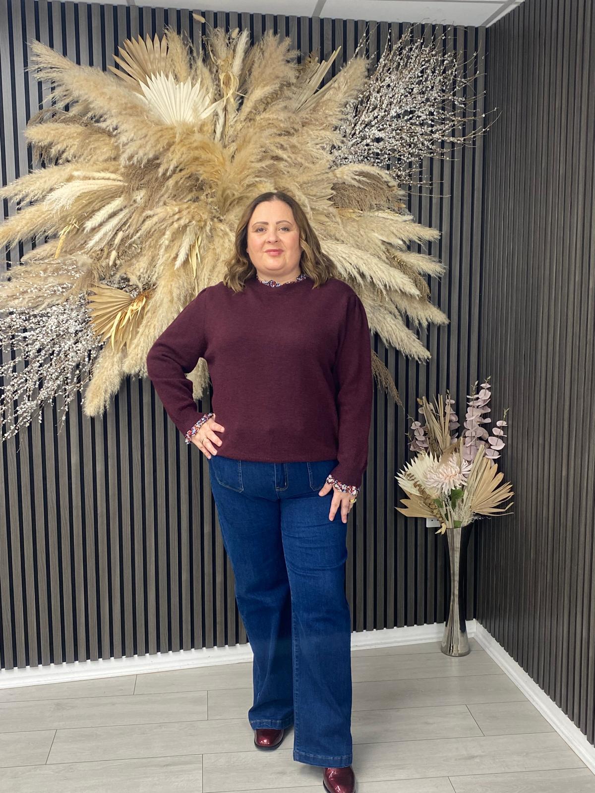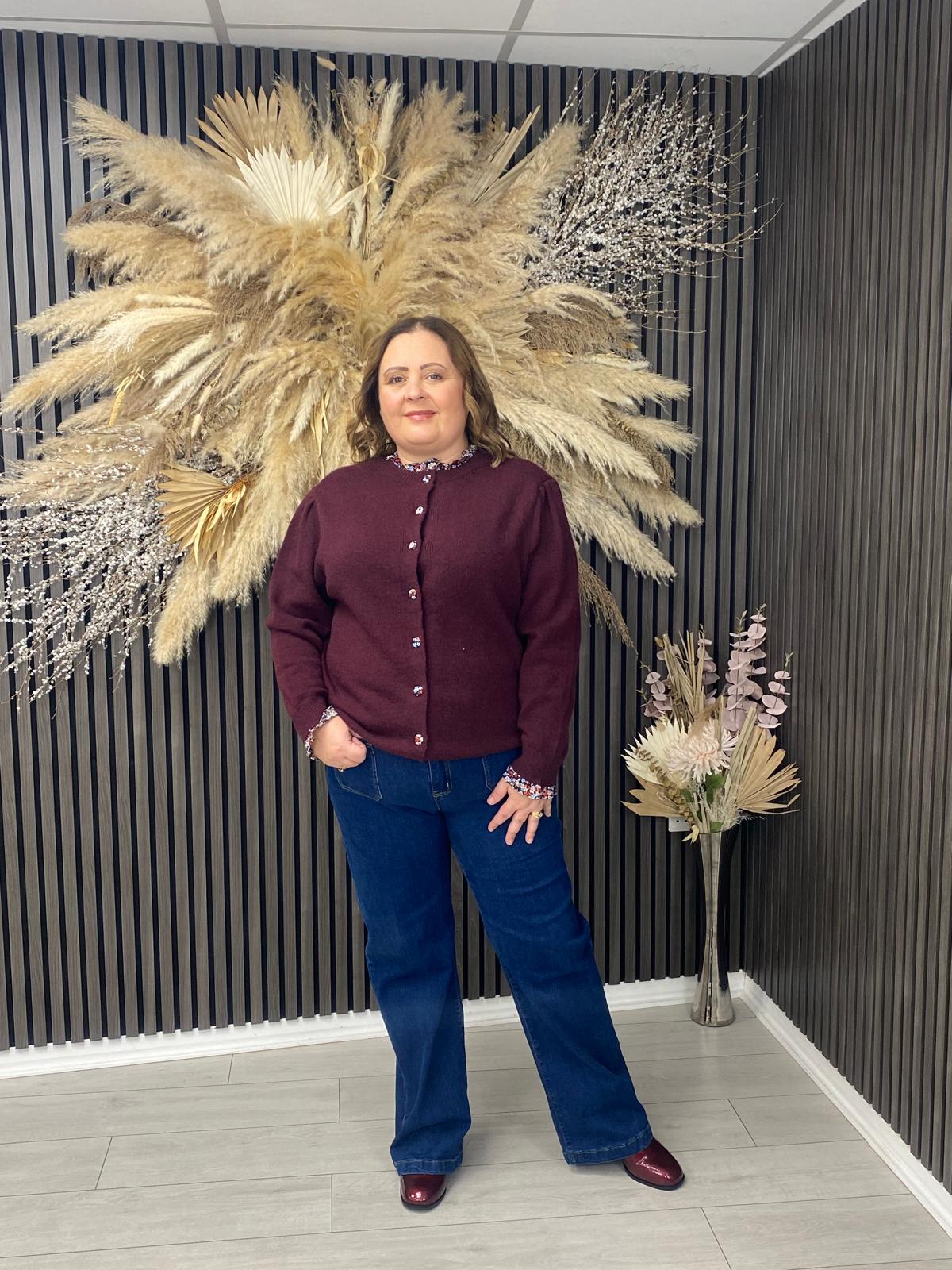 This bordeaux jumper features a distinctive button-up detail along the back.