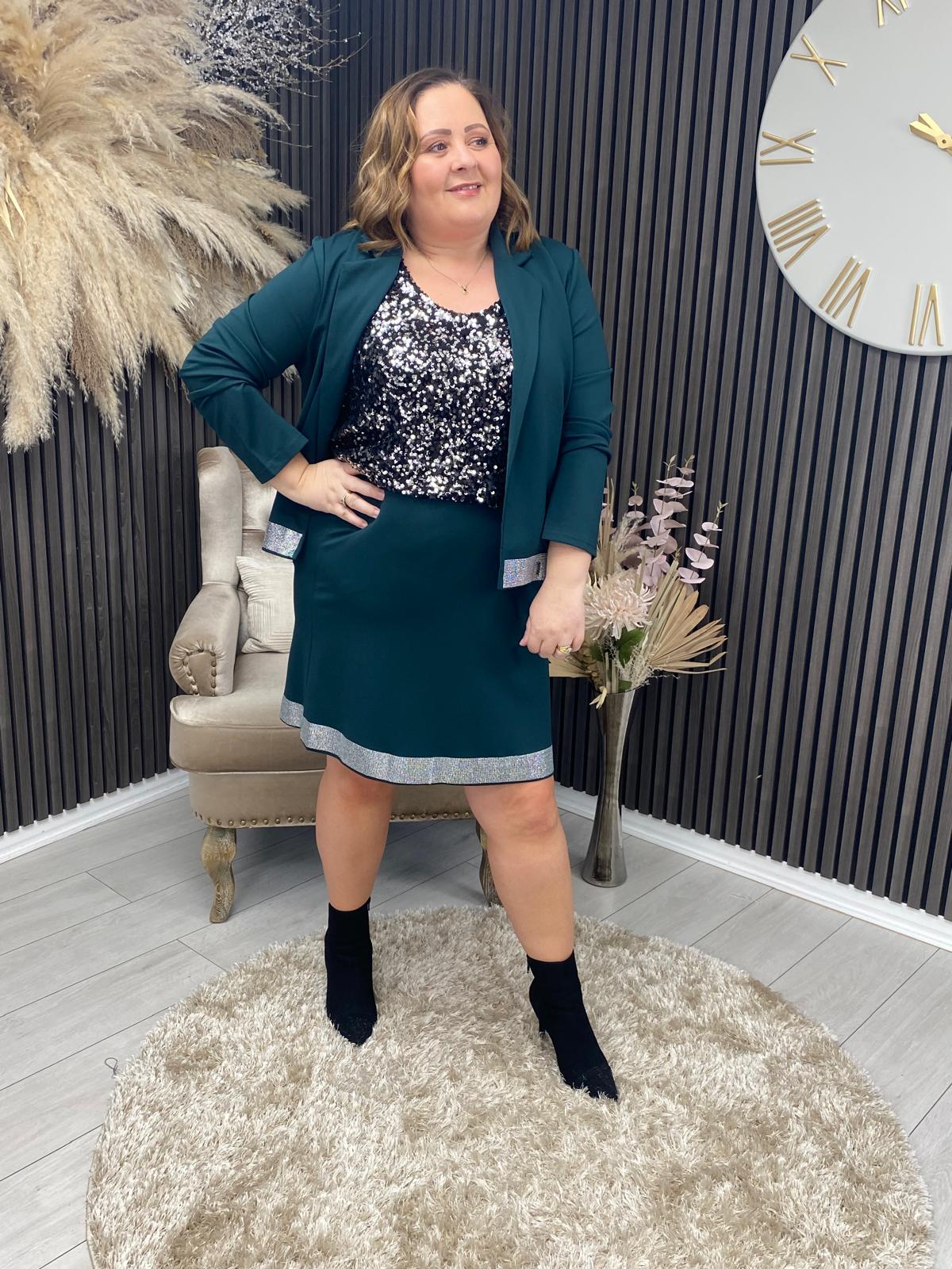 A sophisticated long-sleeve blazer crafted to elevate your wardrobe with timeless elegance. The piece showcases exquisite rhinestone embellishments that add luxury and visual interest. Pair it seamlessly with the coordinating skirt to create a polished, cohesive ensemble perfect for any occasion requiring refined style.