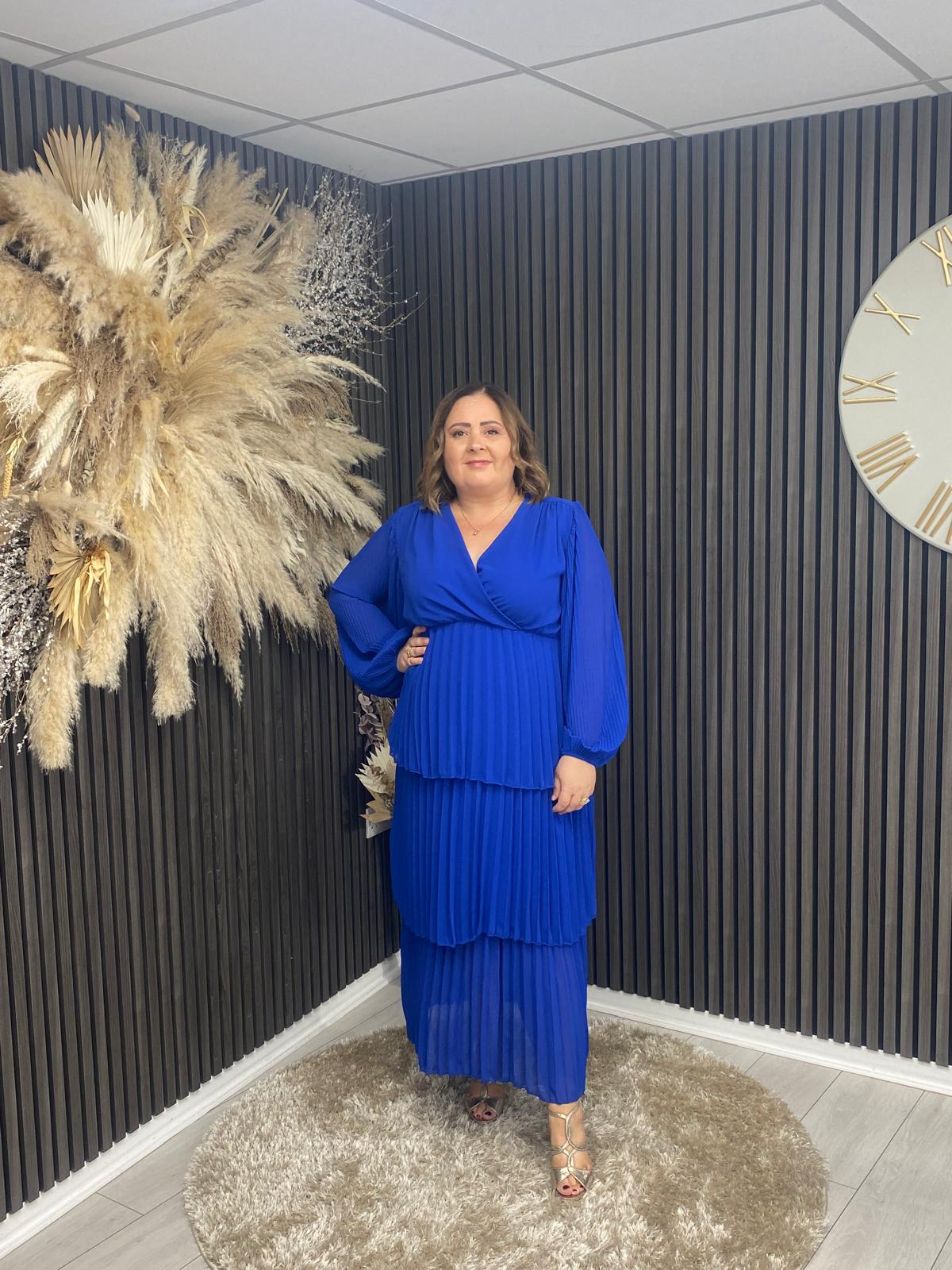 This dress features a pleated design, a wrap-style neckline, and a tiered skirt for a sophisticated silhouette.