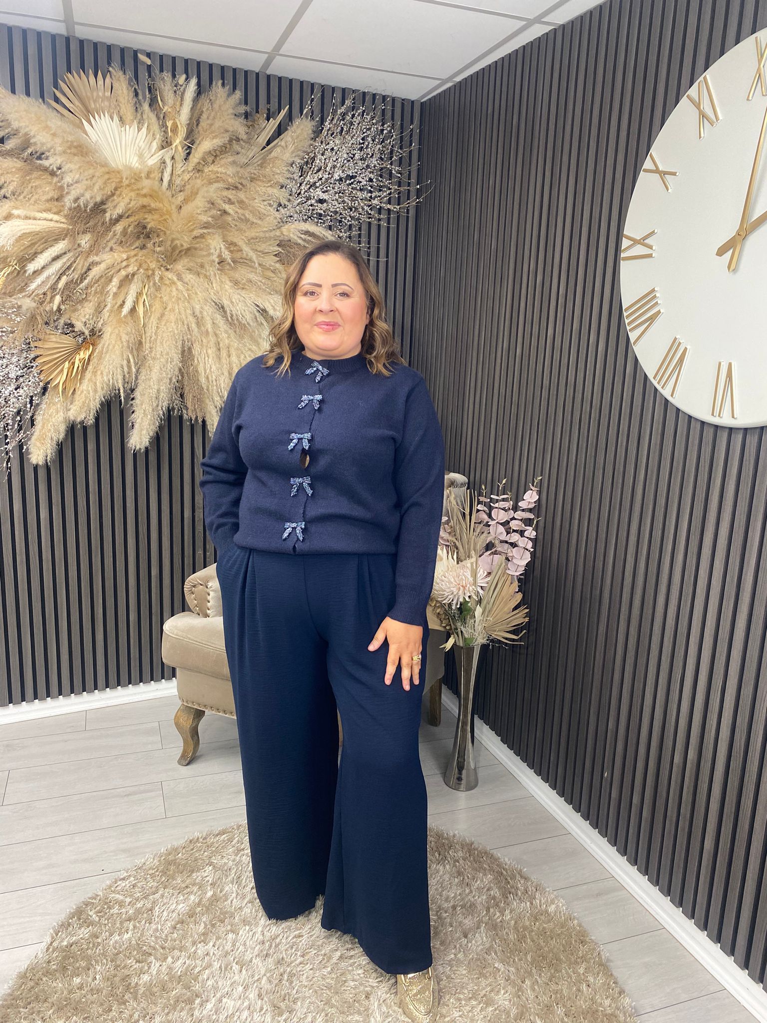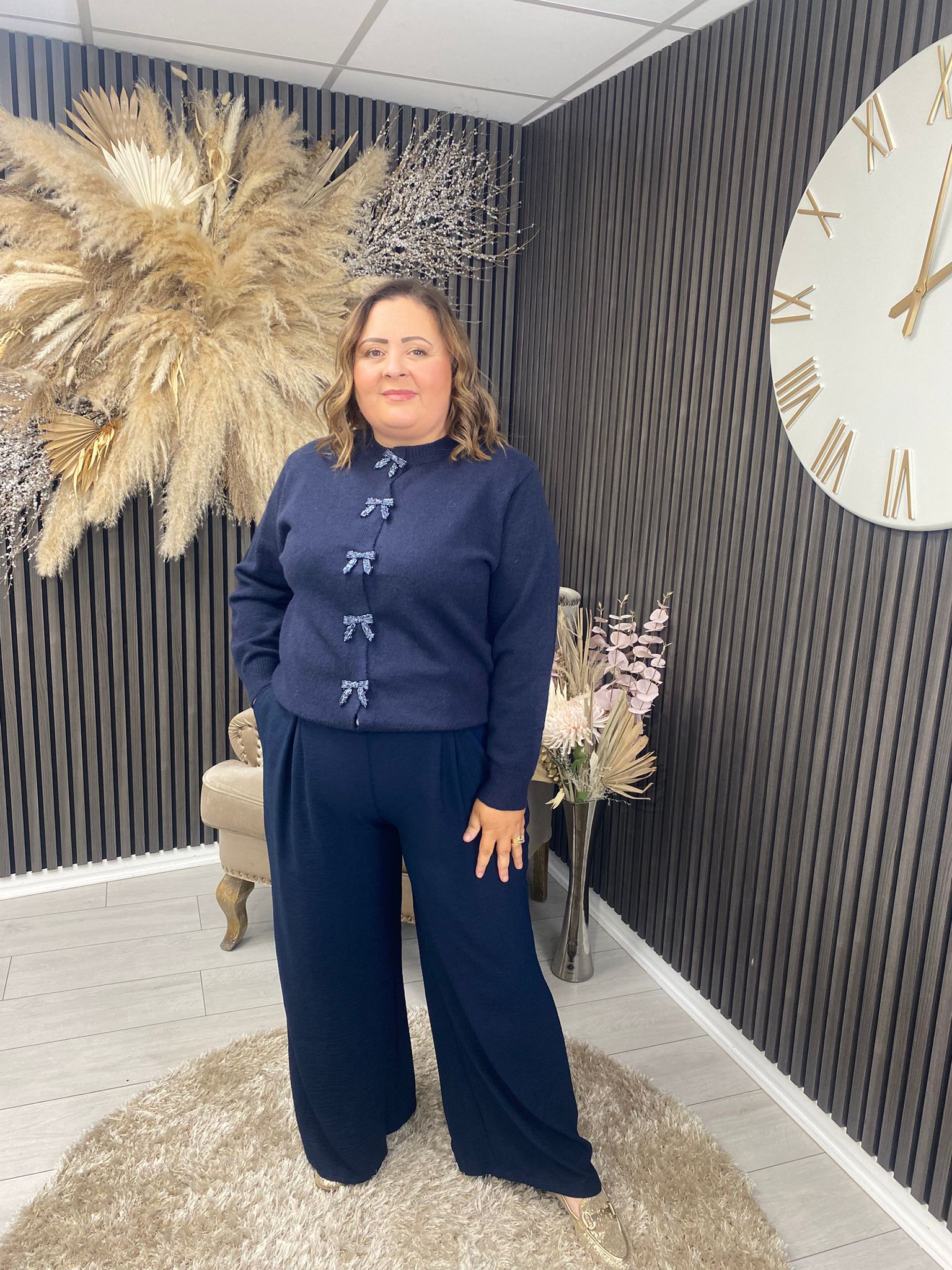 This navy cardigan features elegant sequin bow detail, adding a refined touch to its classic design.