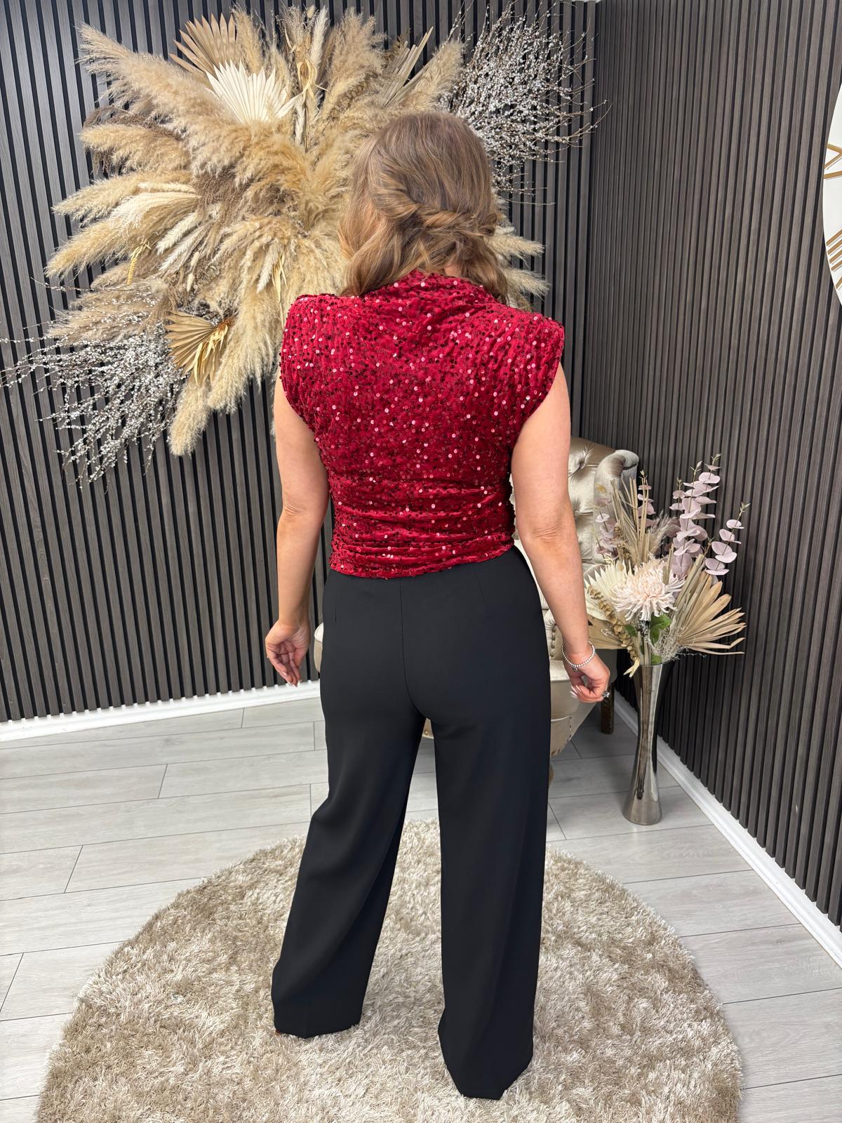 Luxurious velvet paired with shimmering sequin detailing creates an elegant statement piece. This sophisticated top combines sumptuous texture with eye-catching embellishment, perfect for elevating your evening wardrobe with refined glamour.