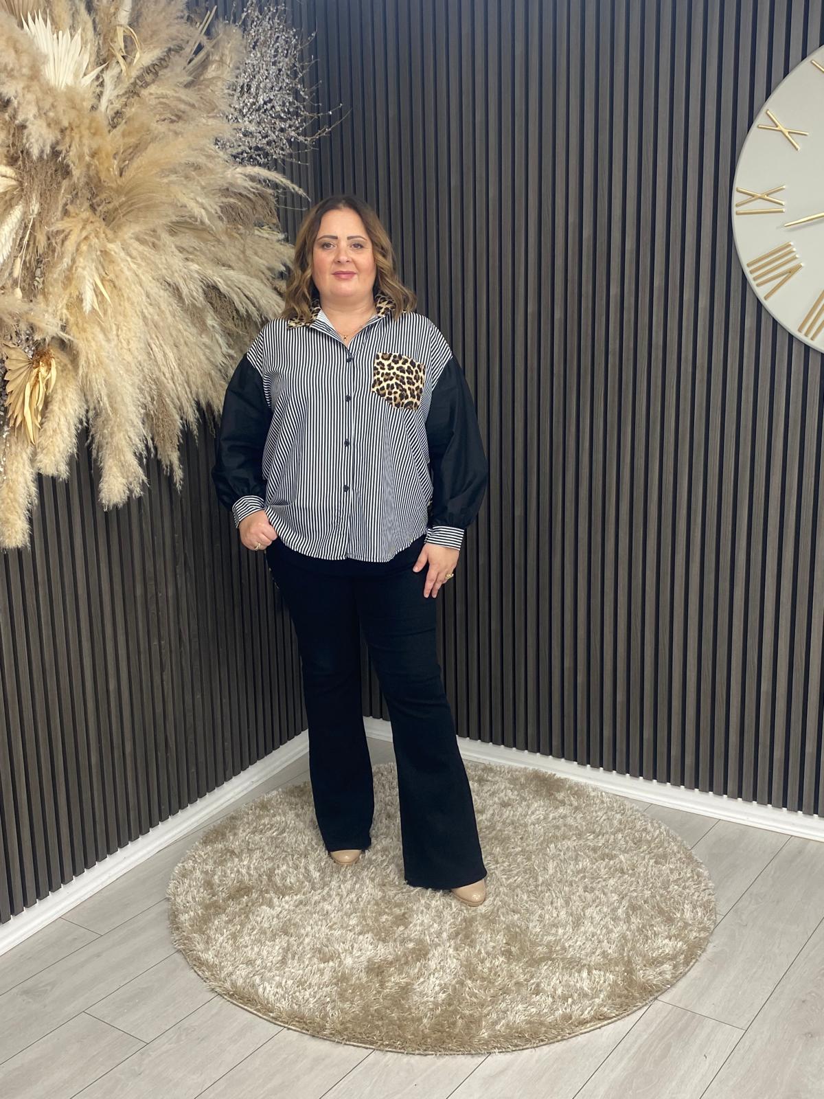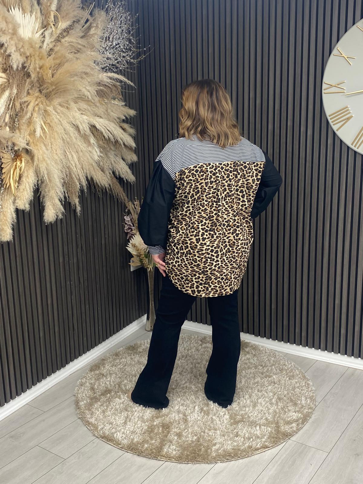 This shirt features a sophisticated blend of camel tones and animal print detailing.