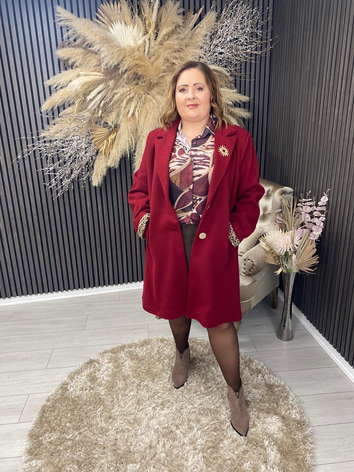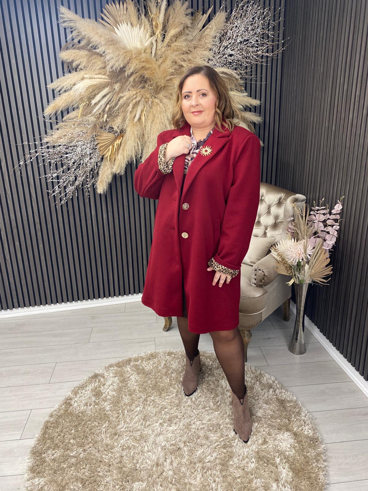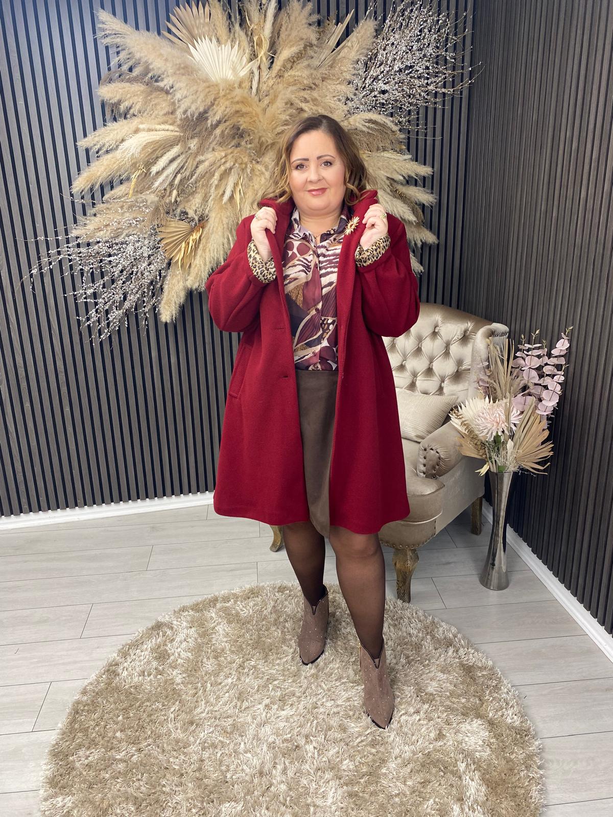 This burgundy coat features a distinctive leopard print lining for a sophisticated edge.