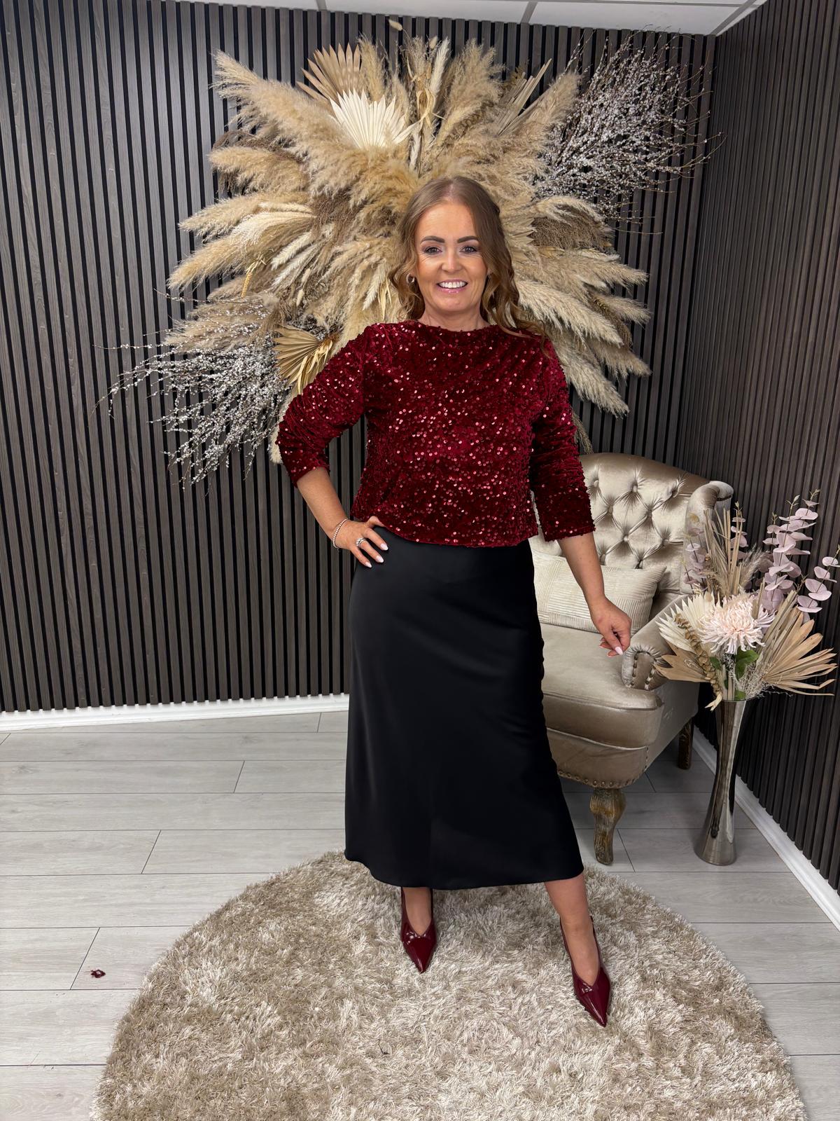 Elegant sequin bow embellishment adorns this sophisticated bordeaux top, delivering refined style with eye-catching detail. Perfect for occasions demanding a touch of glamour and polish.