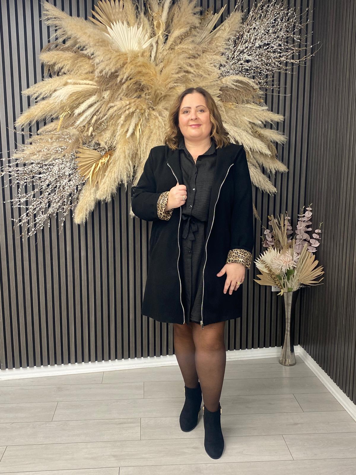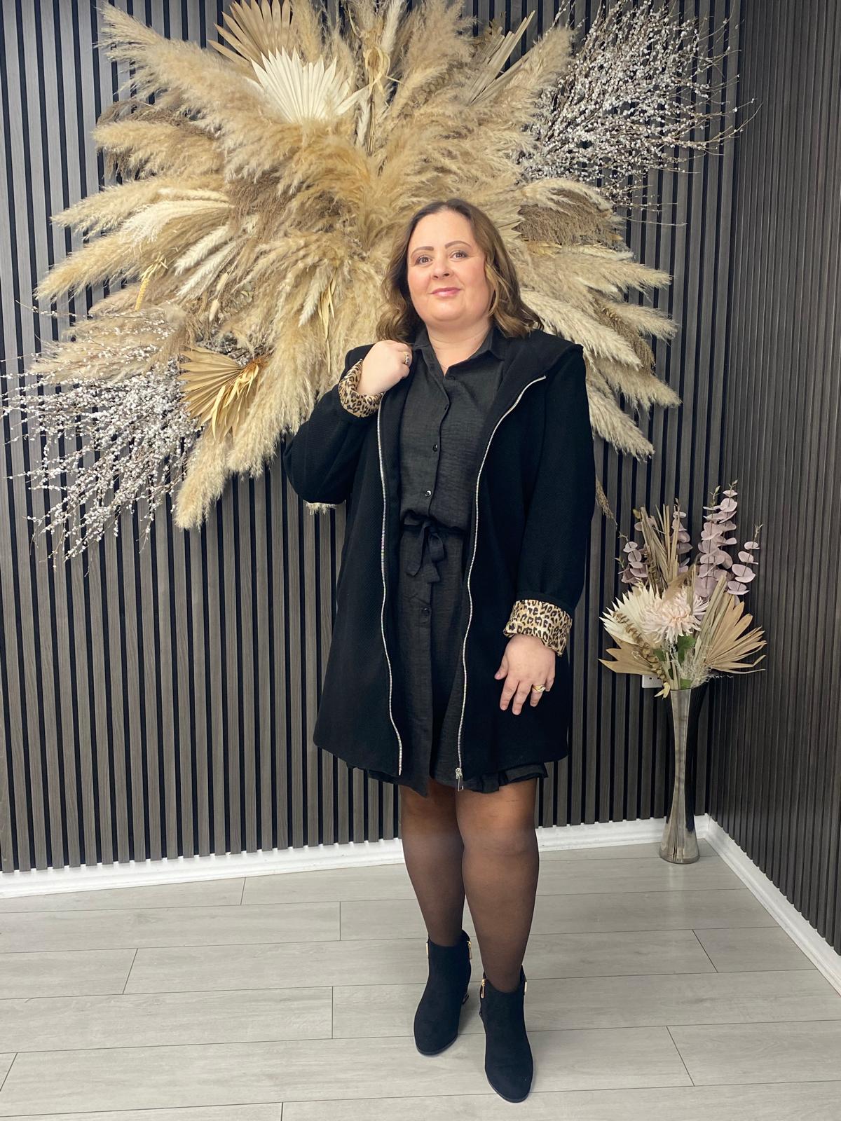 This black coat features a hood and is lined with a stylish animal print for a distinctive touch.