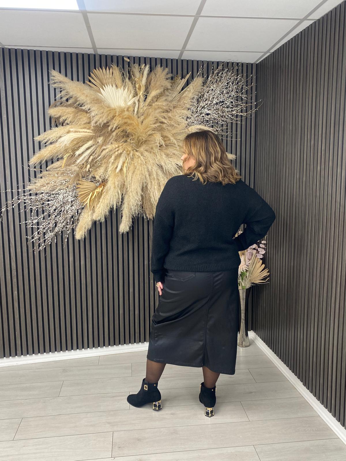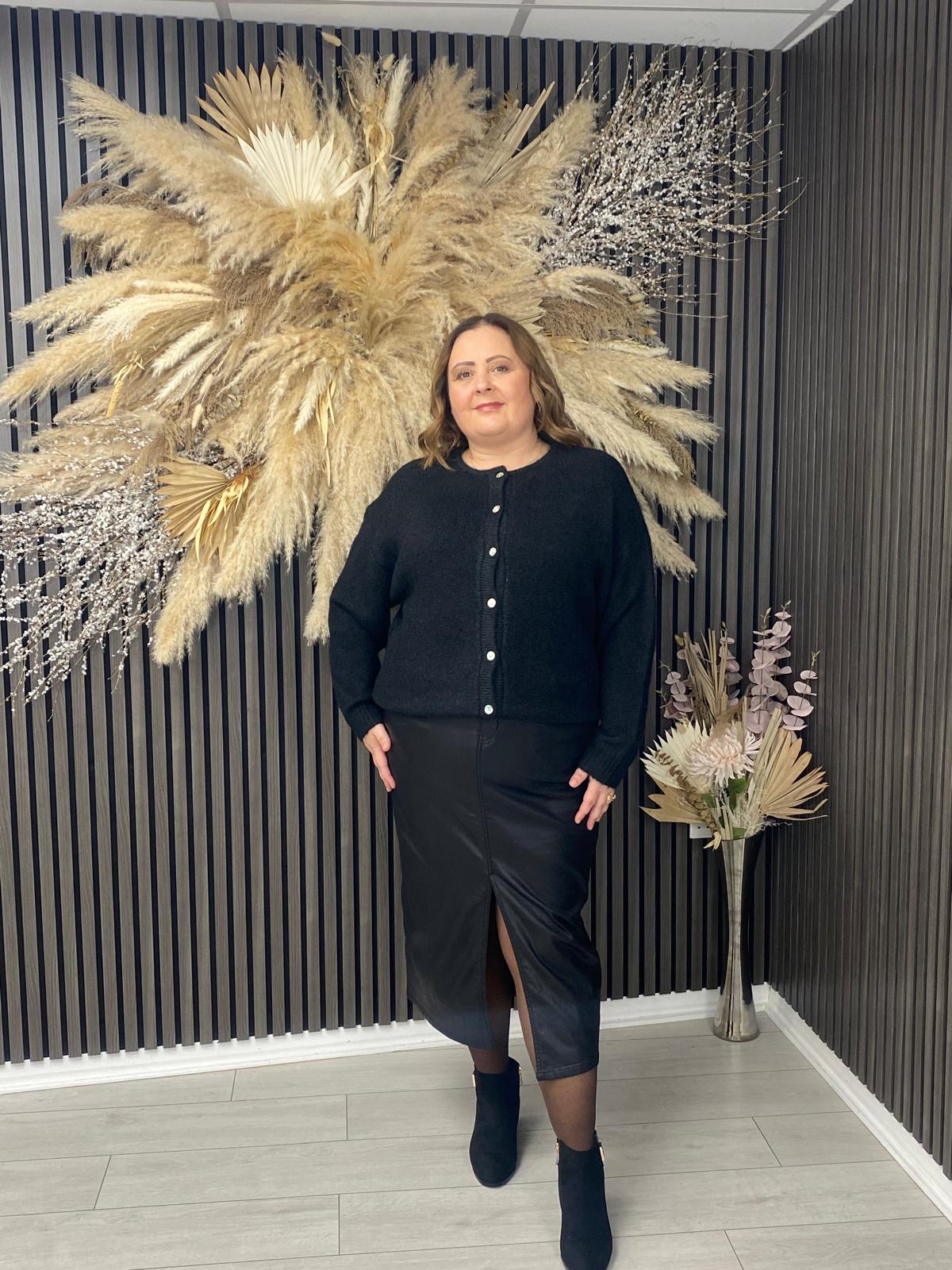 This button-up cardigan is designed to comfortably accommodate sizes 16 through 22.