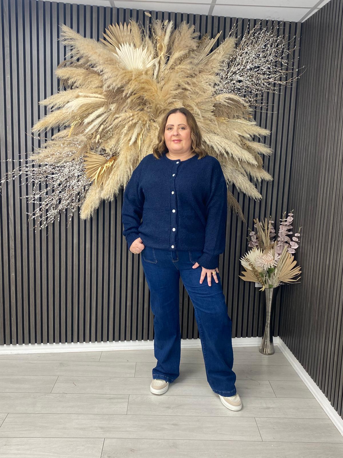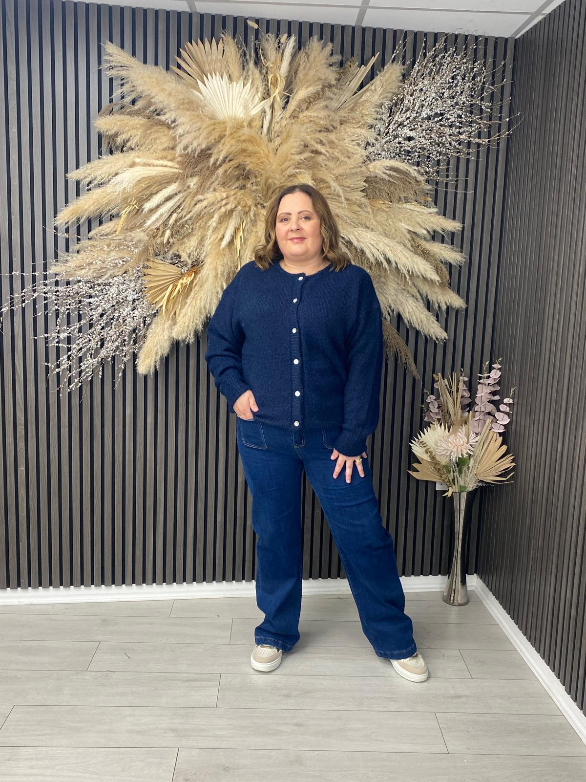 This button-up cardigan is designed to comfortably accommodate sizes 16 through 22.