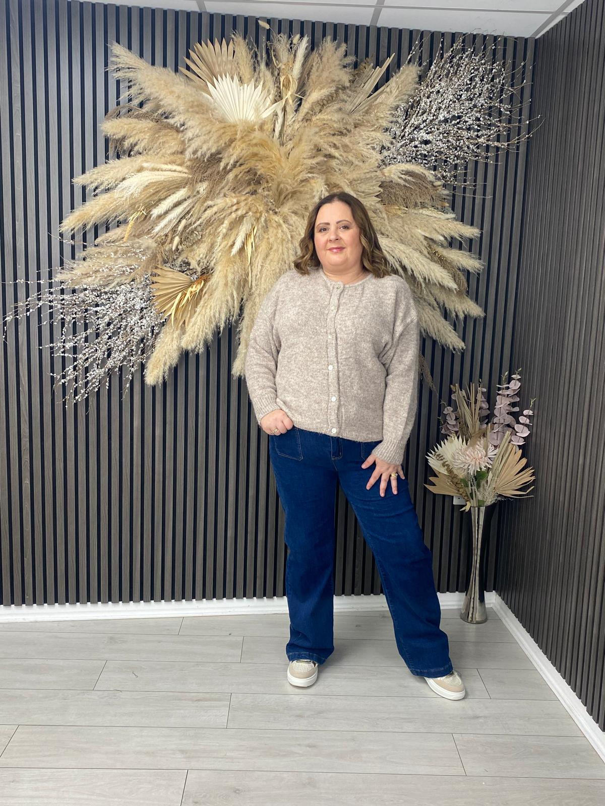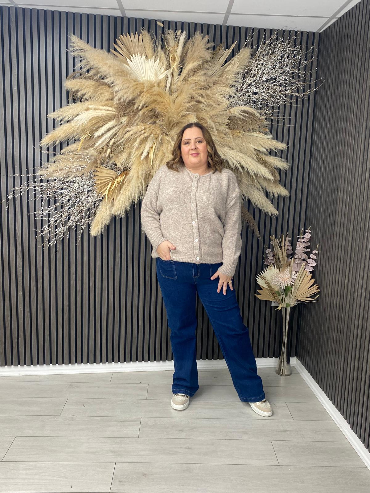 This button-up cardigan is designed to comfortably accommodate sizes 16 through 22.