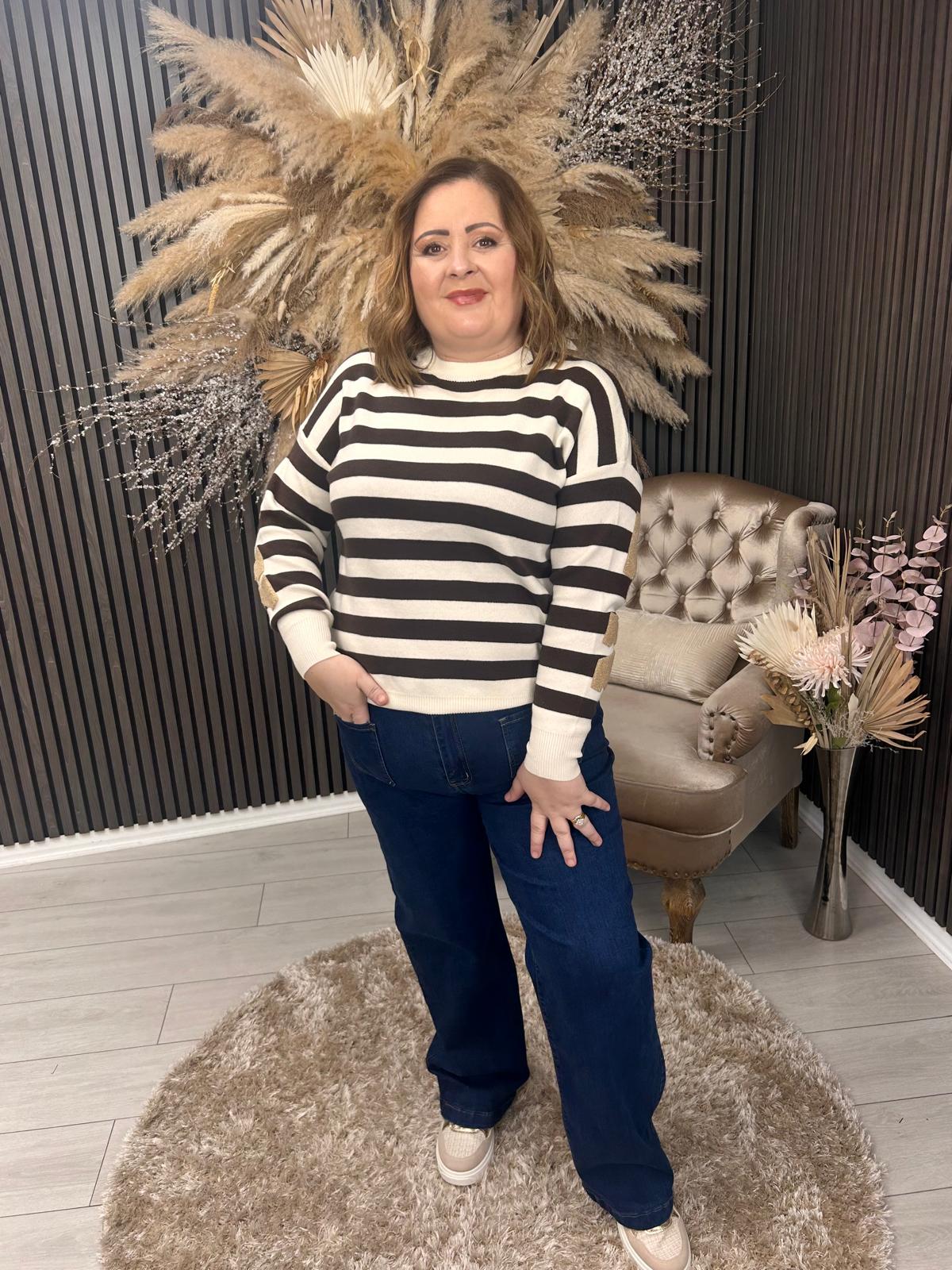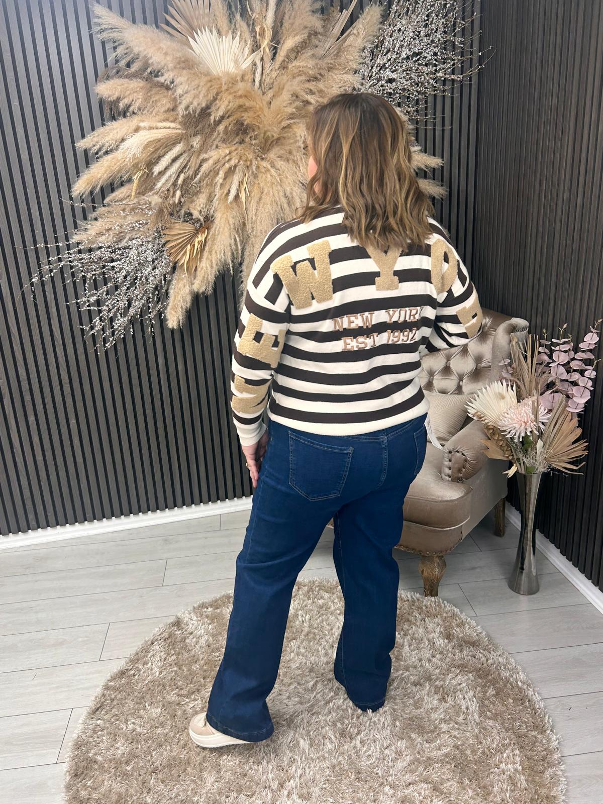 Oversized silhouette featuring an embossed New York slogan across the back, complemented by a striking striped pattern throughout. This contemporary jumper combines relaxed comfort with distinctive design details, making it an effortless addition to your everyday wardrobe.