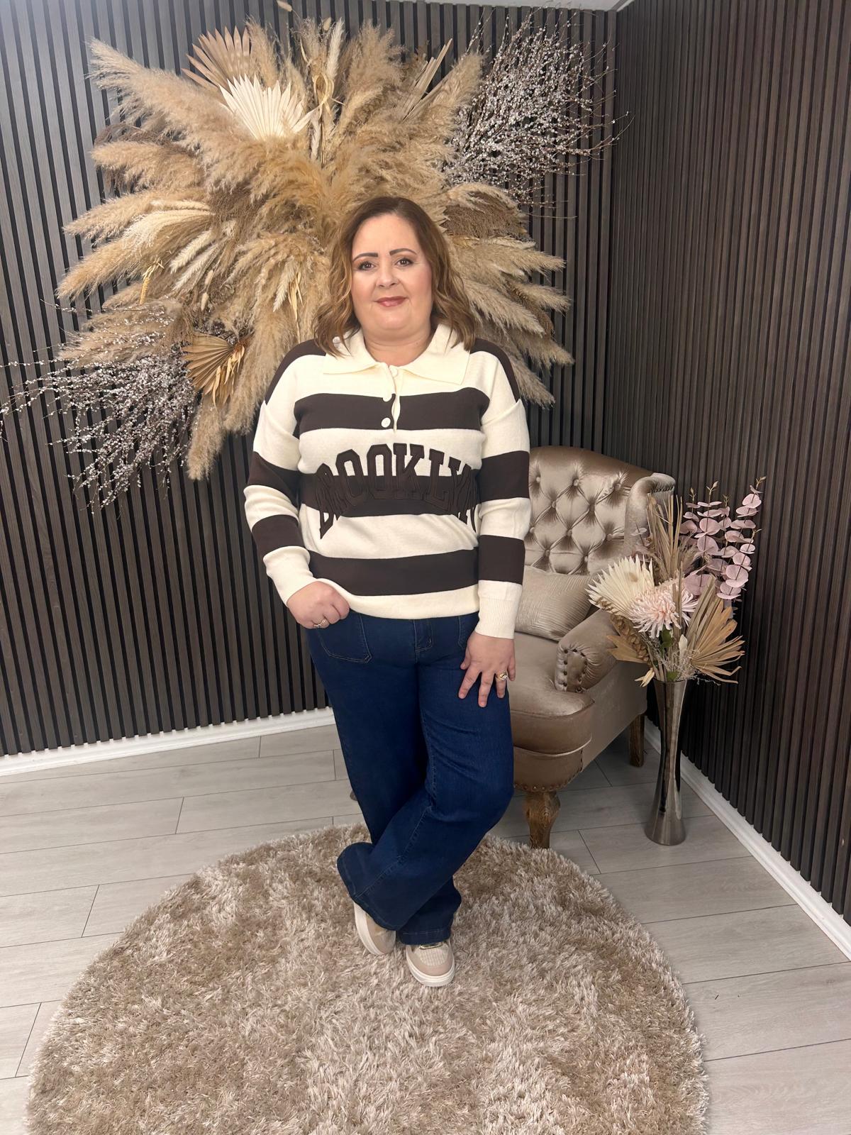 This sophisticated long-sleeve jumper features a distinctive striped pattern paired with a Brooklyn slogan graphic. The half-folded collar with button closure adds refined detail, while the relaxed fit delivers everyday comfort with contemporary edge. Perfect for layering or wearing standalone, this piece combines casual style with understated elegance.