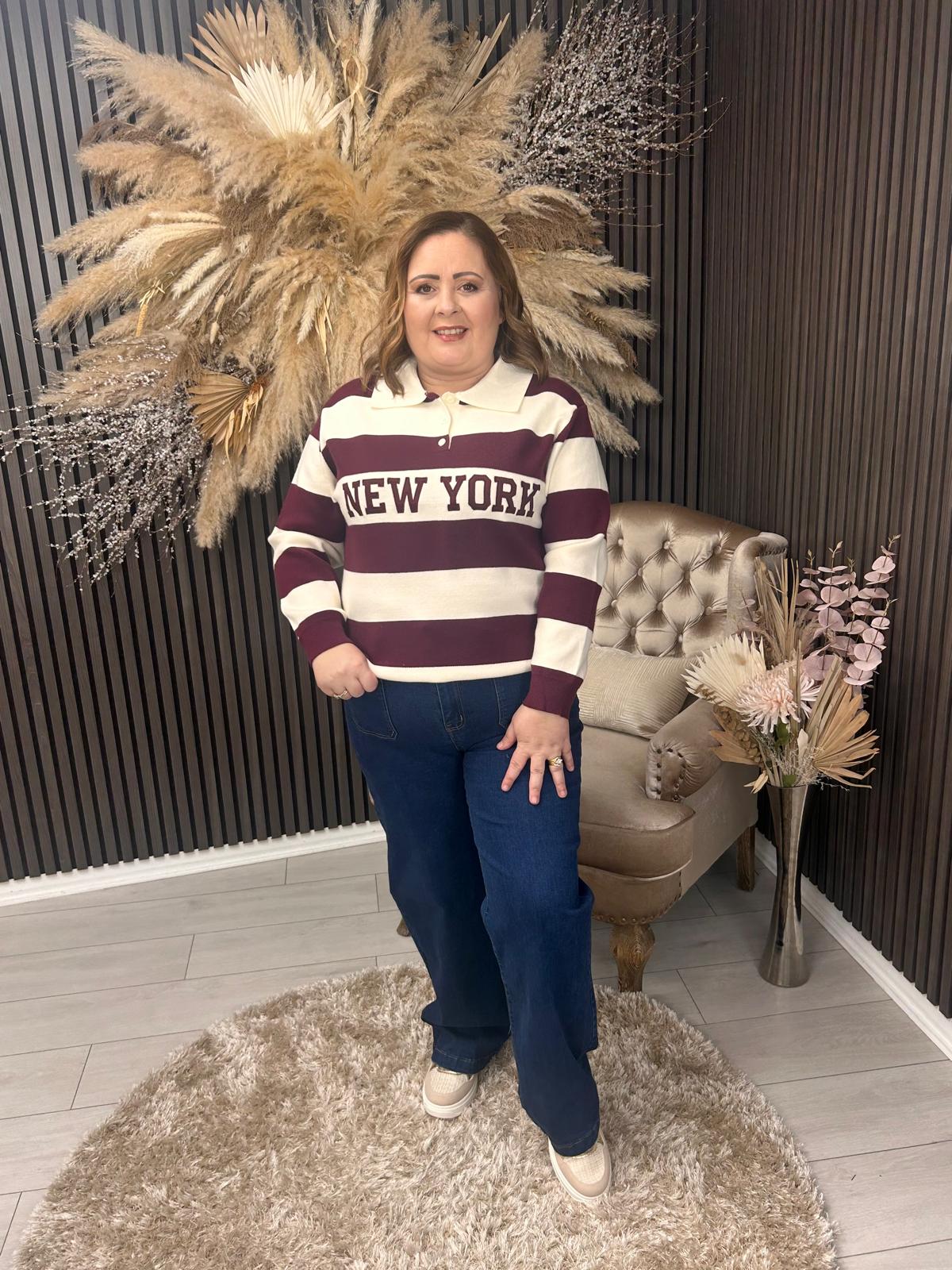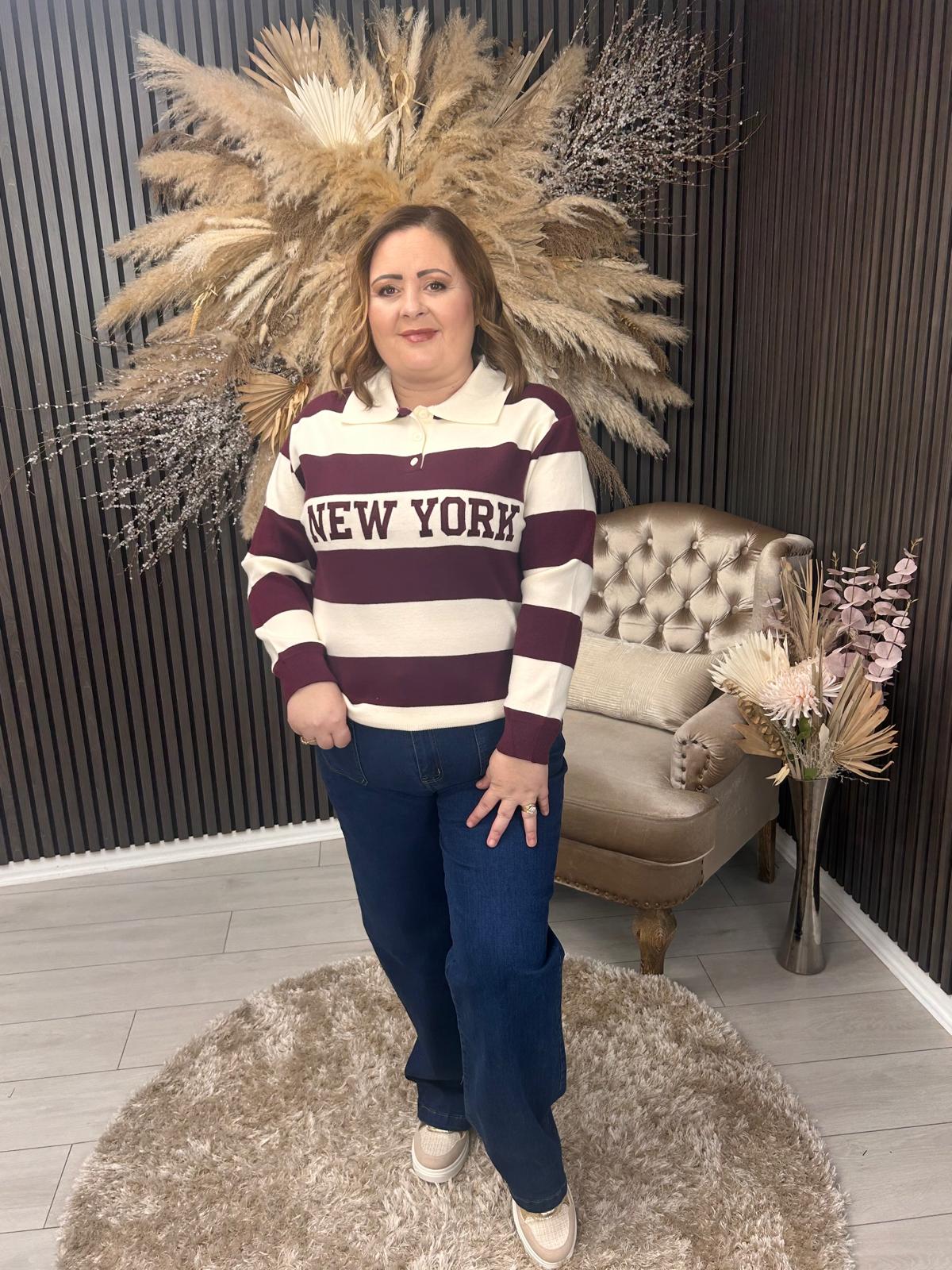 This sophisticated long-sleeve jumper features a distinctive striped pattern paired with a Brooklyn slogan graphic. The half-folded collar with button closure adds refined detail, while the relaxed fit delivers everyday comfort with contemporary edge. Perfect for layering or wearing standalone, this piece combines casual style with understated elegance.