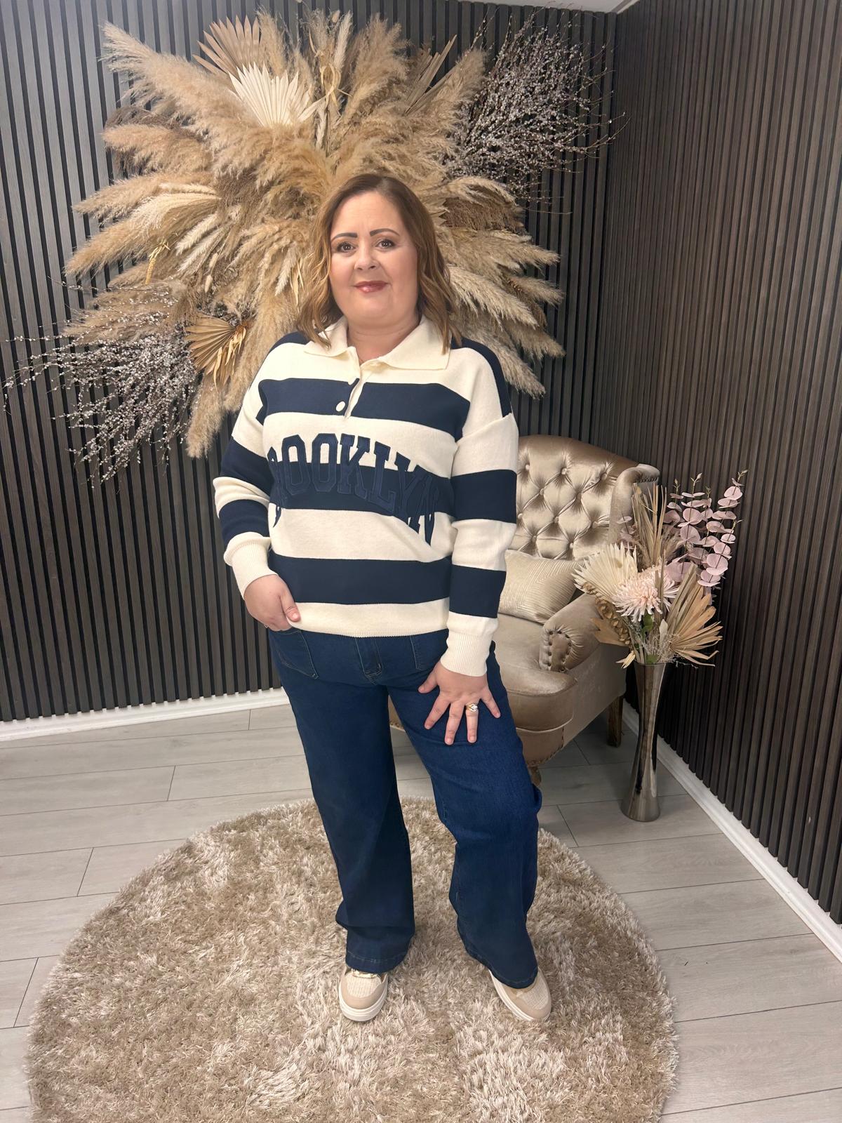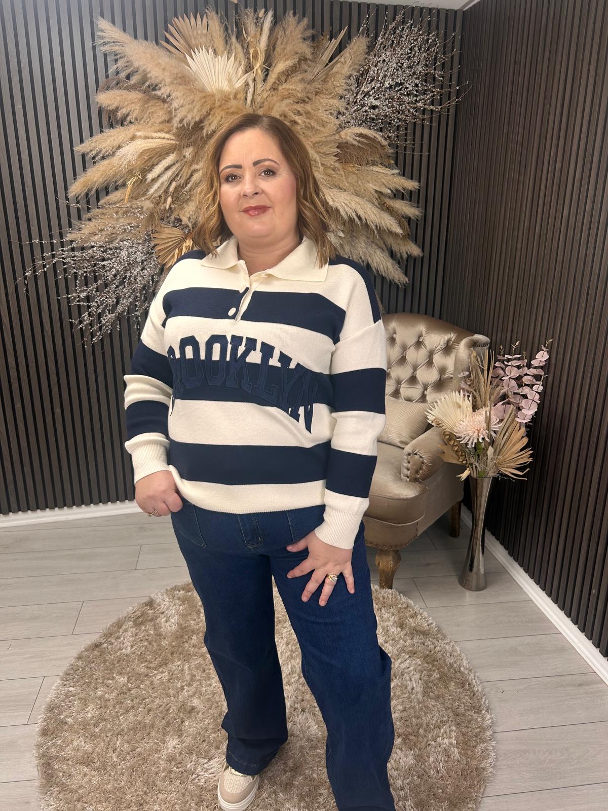This sophisticated long-sleeve jumper features a distinctive striped pattern paired with a Brooklyn slogan graphic. The half-folded collar with button closure adds refined detail, while the relaxed fit delivers everyday comfort with contemporary edge. Perfect for layering or wearing standalone, this piece combines casual style with understated elegance.