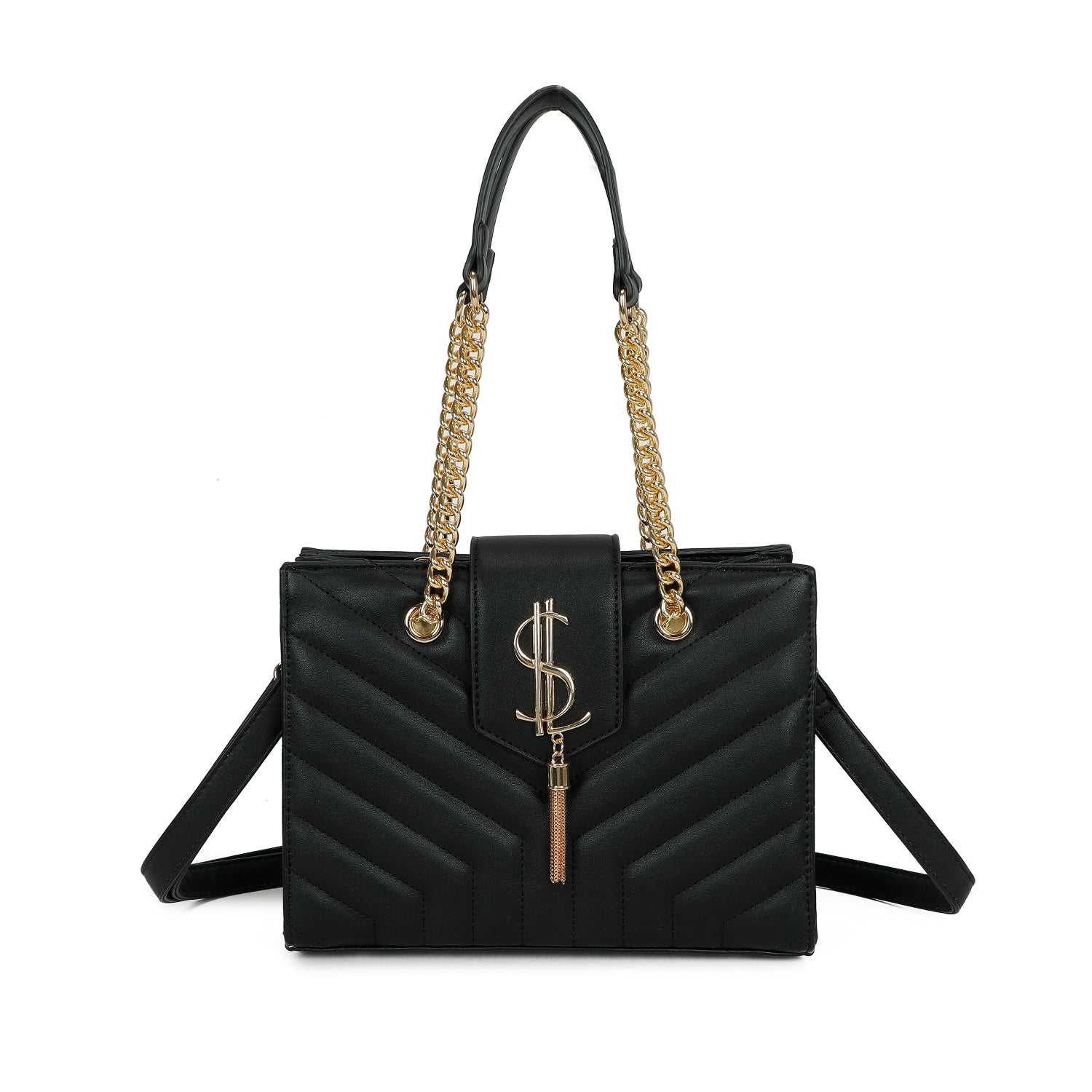 Featuring a top zip closure and an additional magnetic snap fastening, this bag showcases a quilted pattern for a refined look. It includes a detachable, adjustable long strap alongside long shoulder straps for versatile carrying options. Inside, you'll find a zipped pocket and slip pockets for organized storage. Accented with gold metal hardware, this piece combines functionality with elegant detailing.