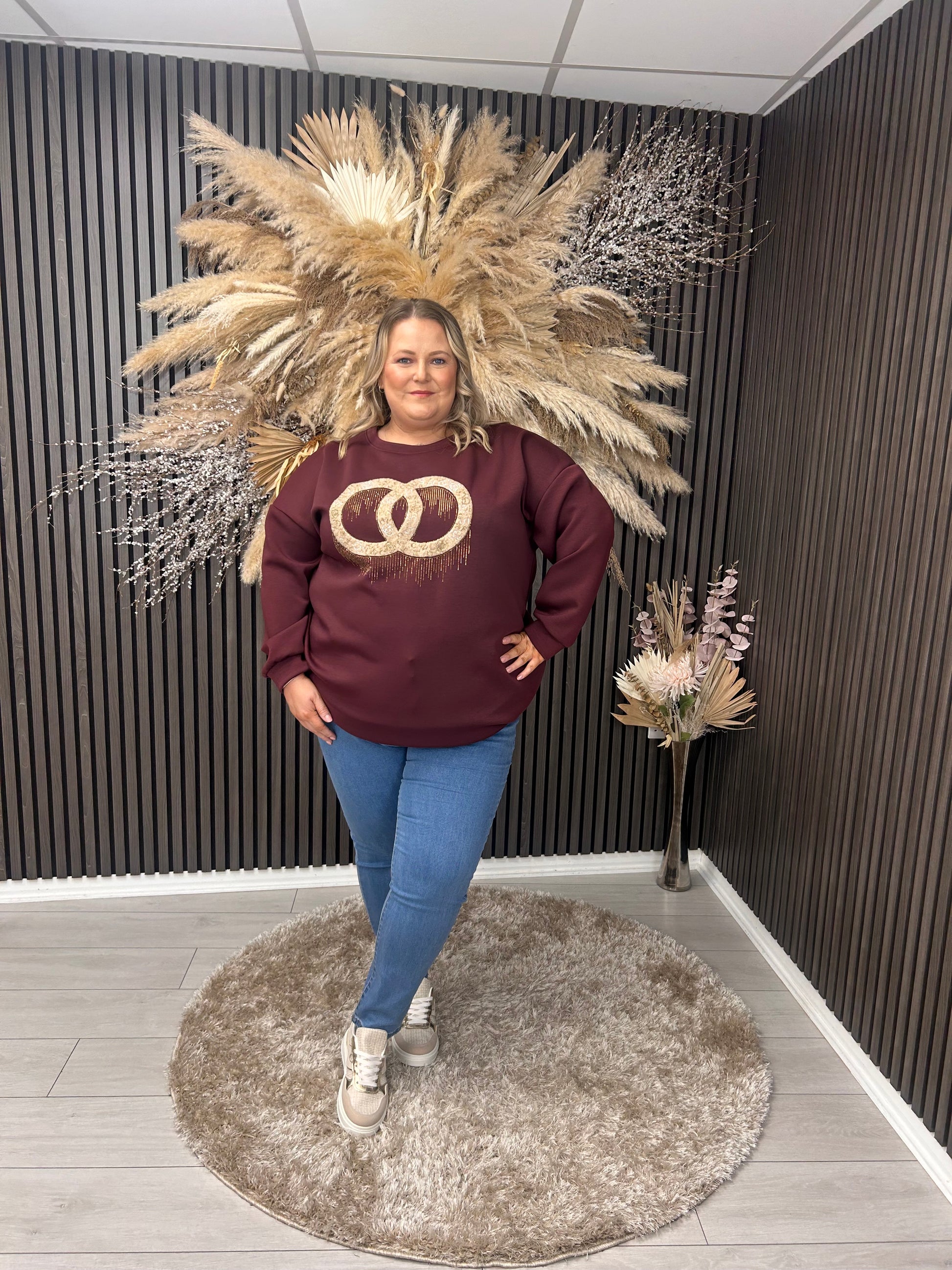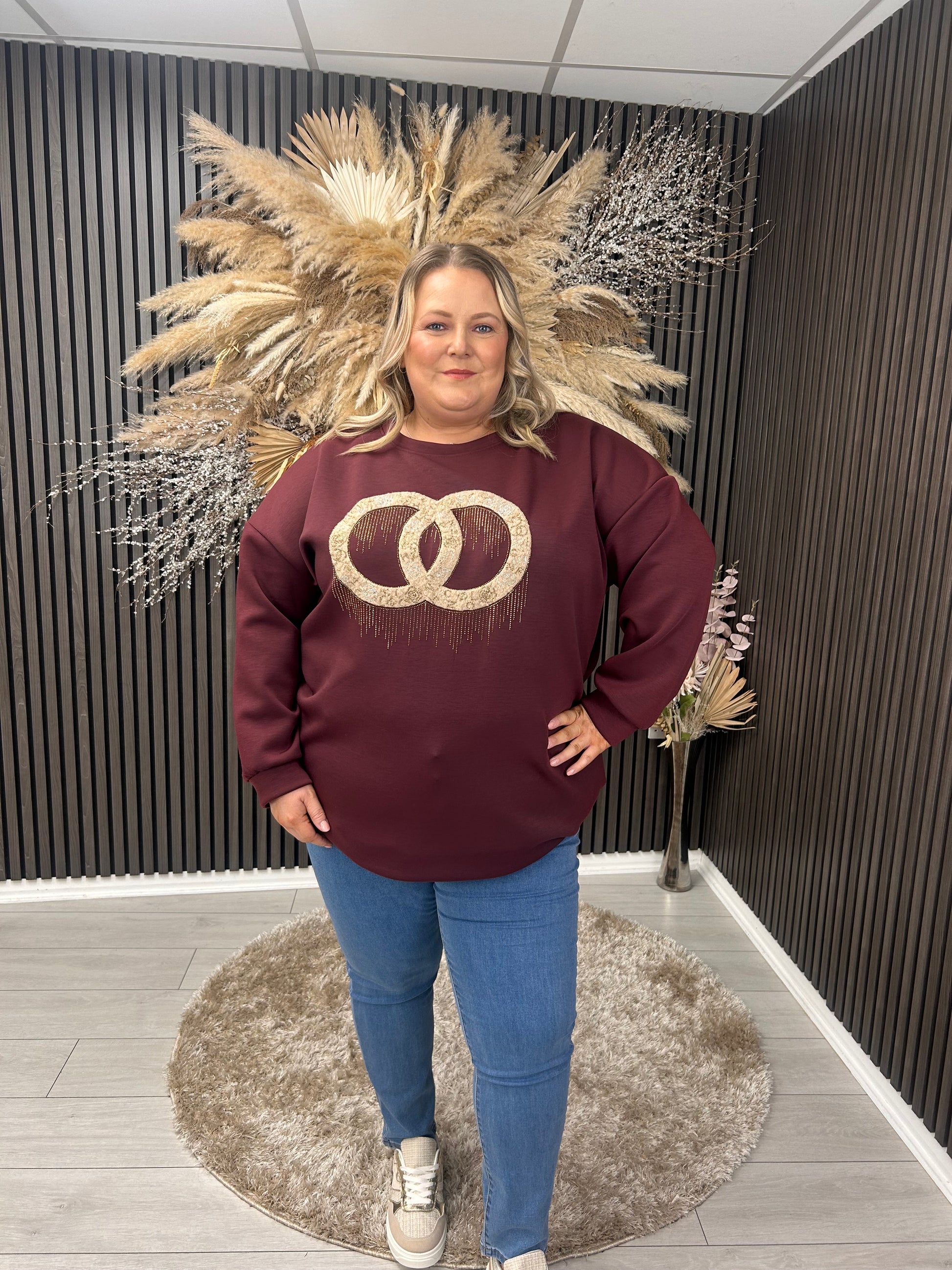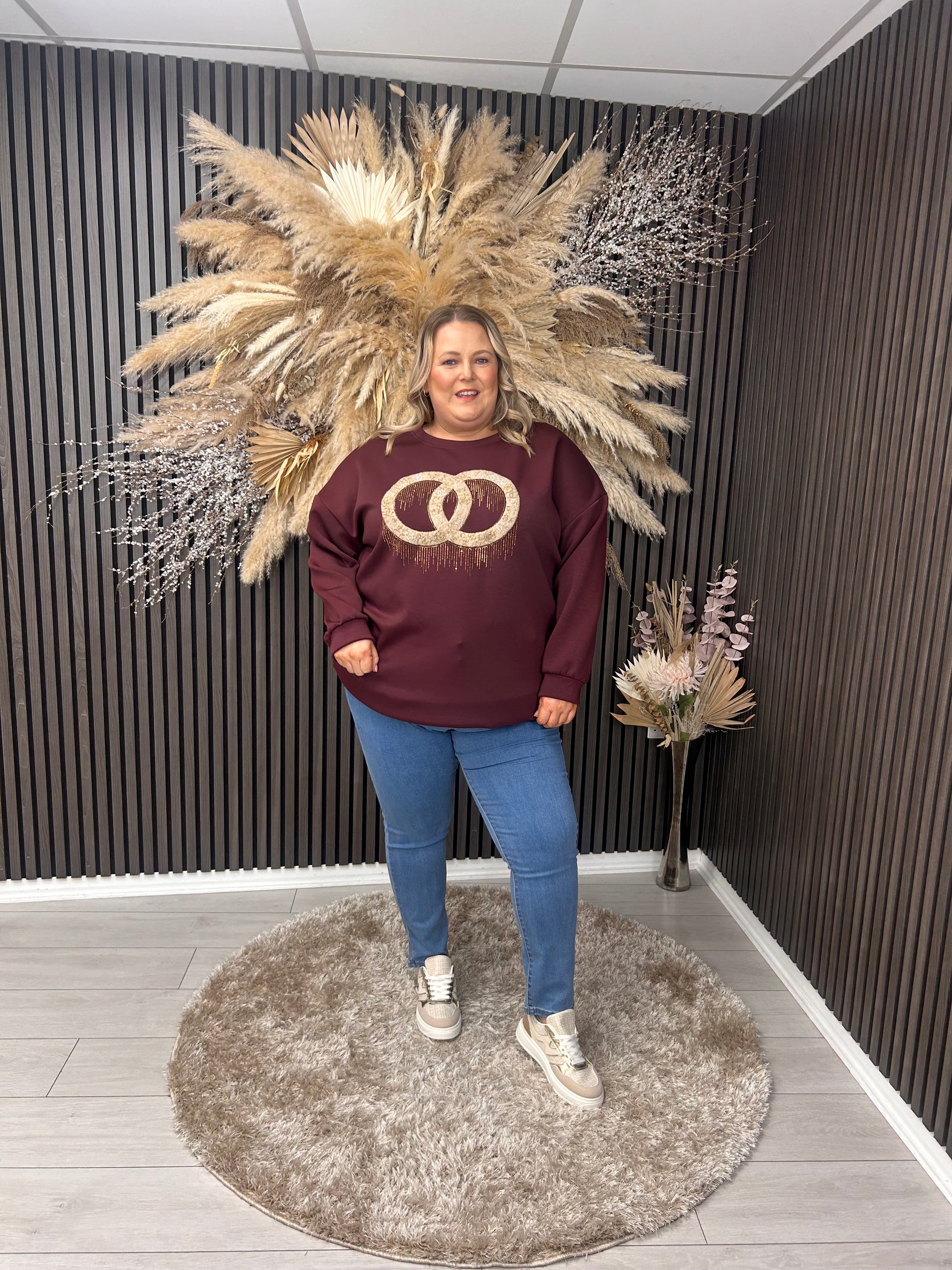 This wine jumper features a soft fabric and is adorned with an intricate embellished pattern on the front.