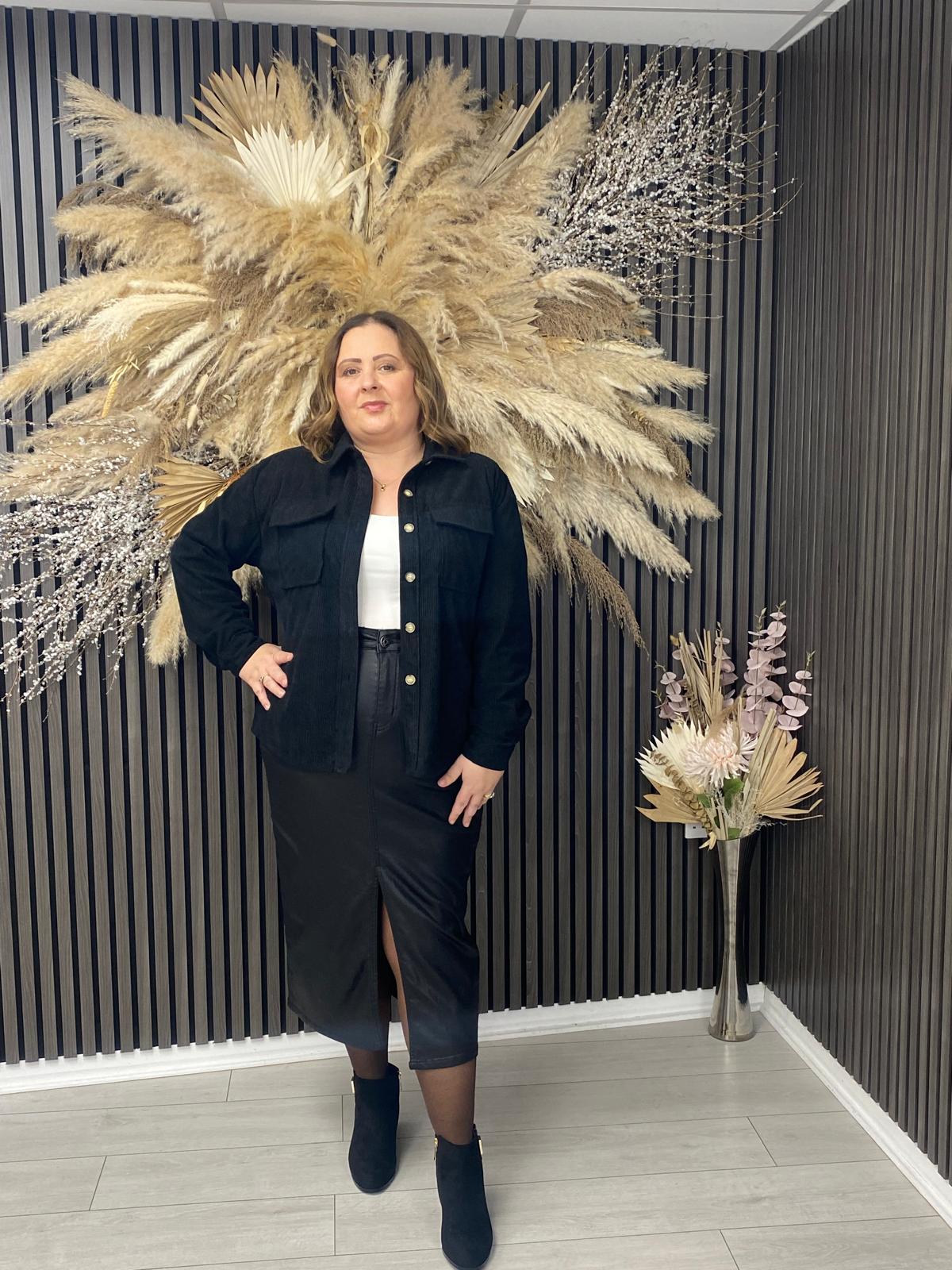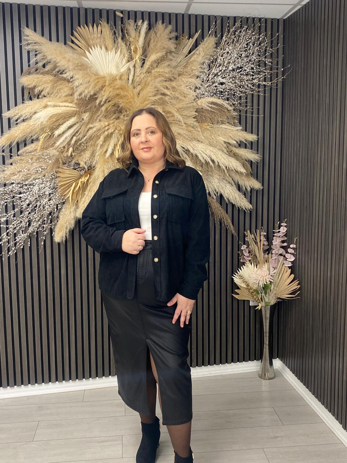 This black corduroy jacket features a button-front closure and a classic collar, combining timeless style with versatile wearability.
