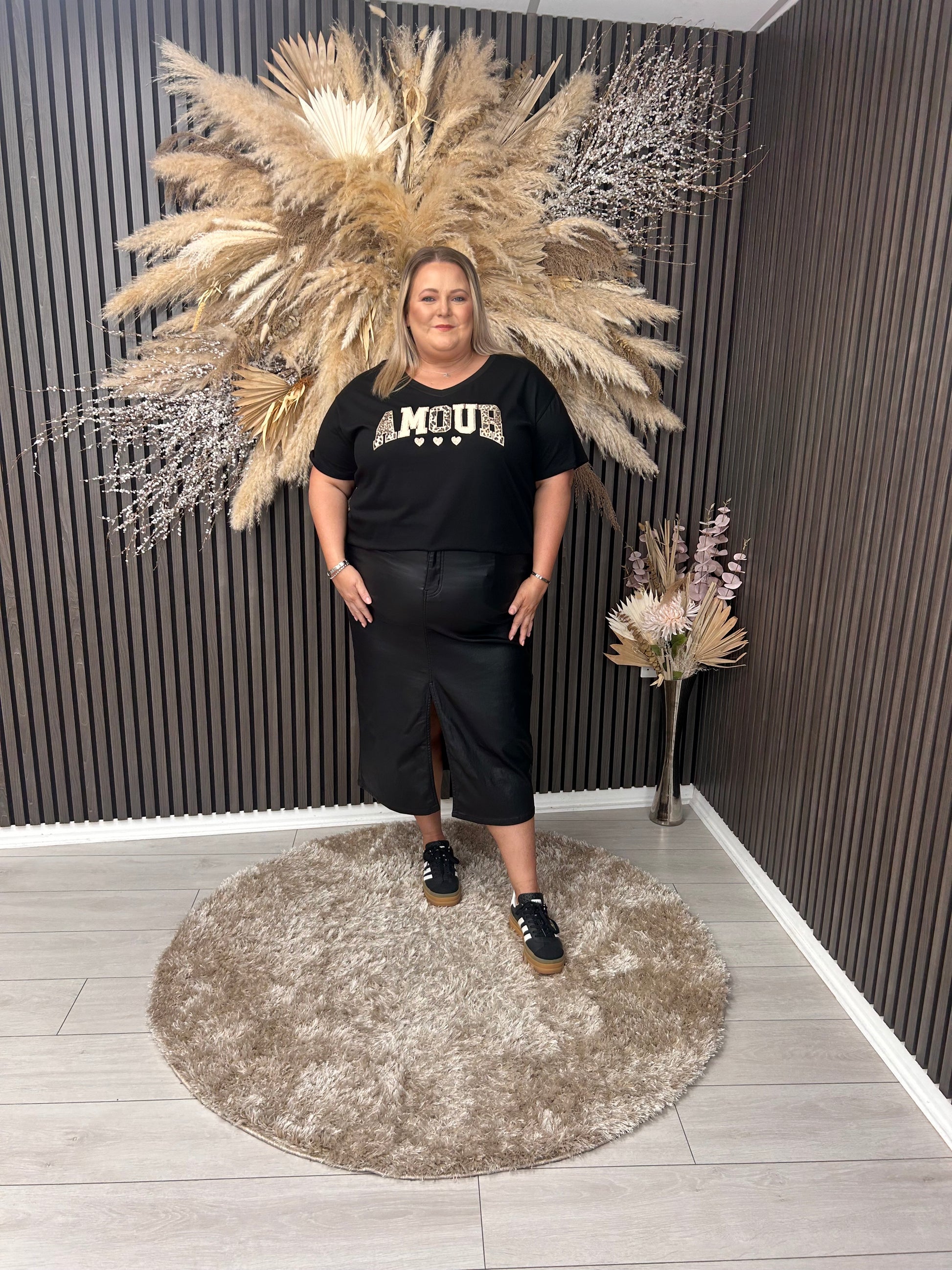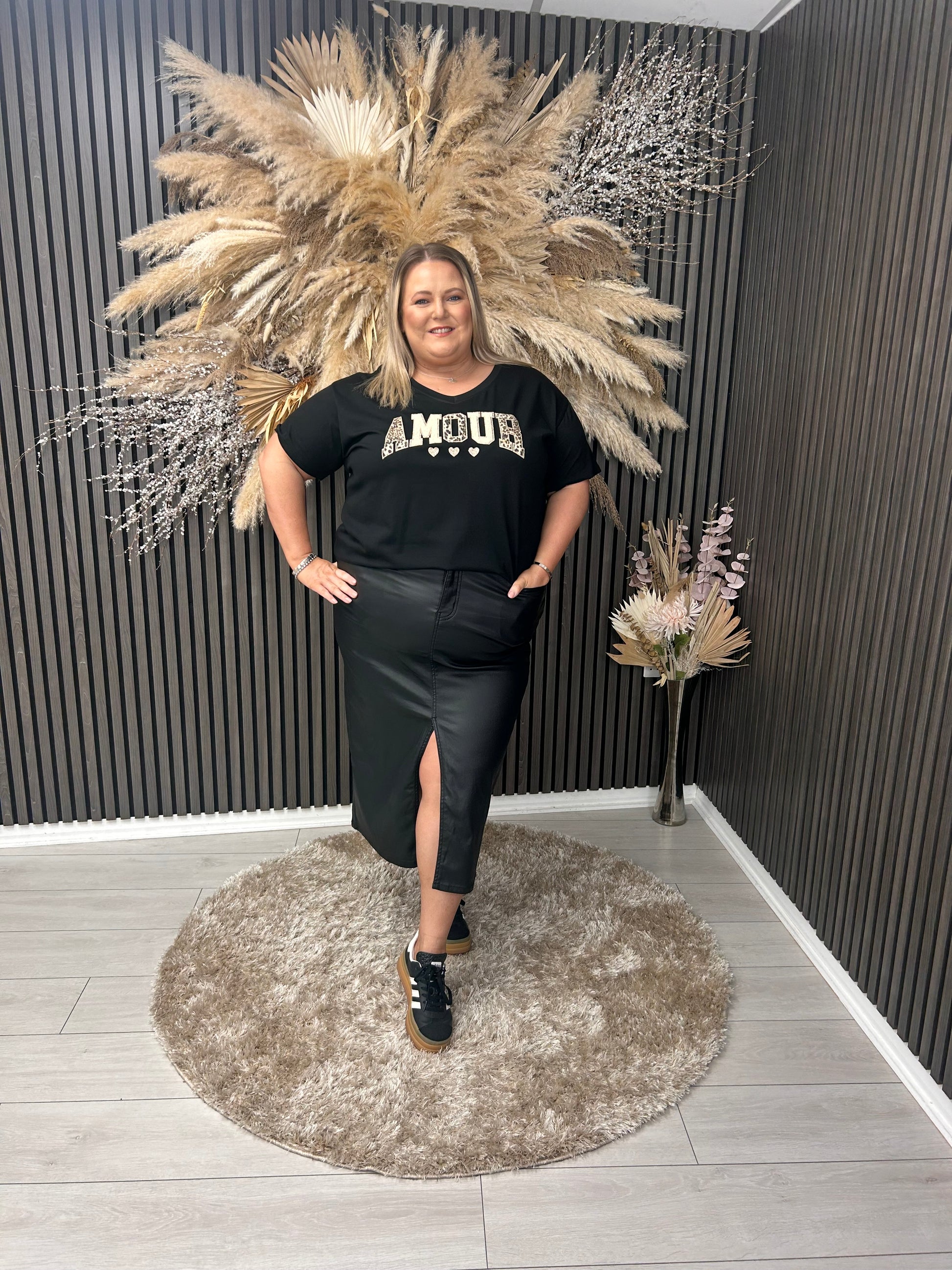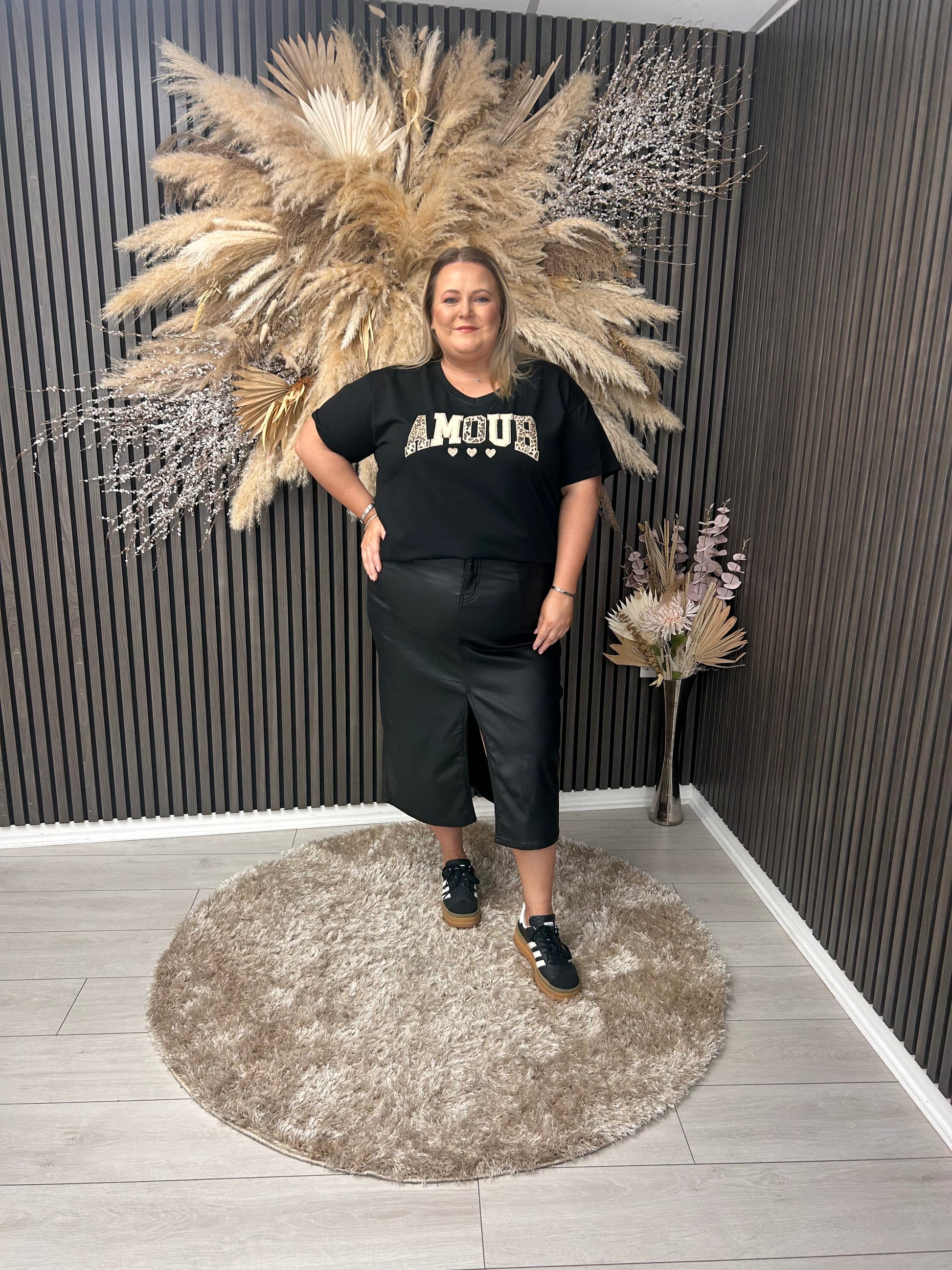 This brown t-shirt features an animal print Amour logo, blending style with subtle detail.