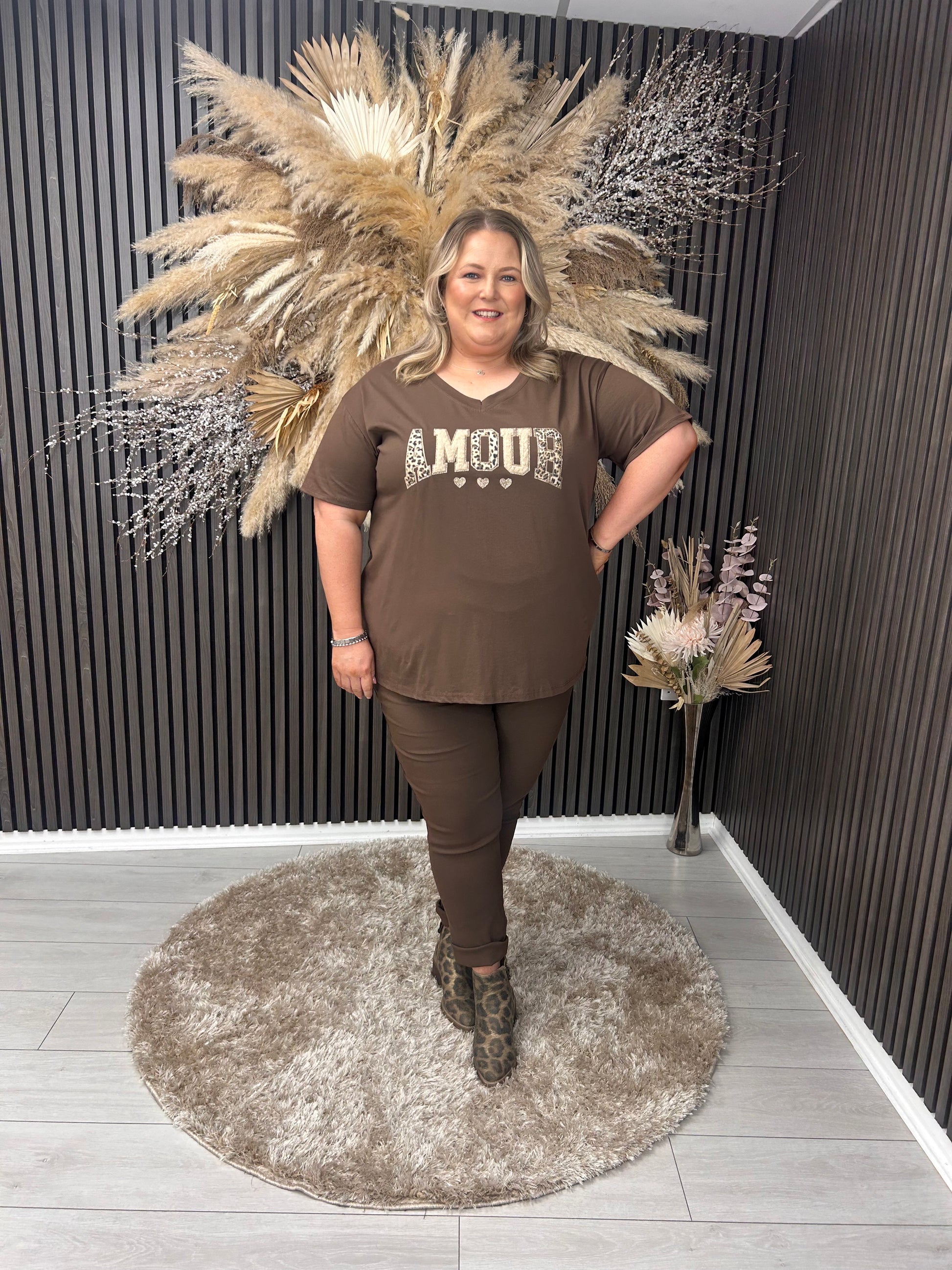 This brown t-shirt features an animal print Amour logo, blending style with subtle detail.