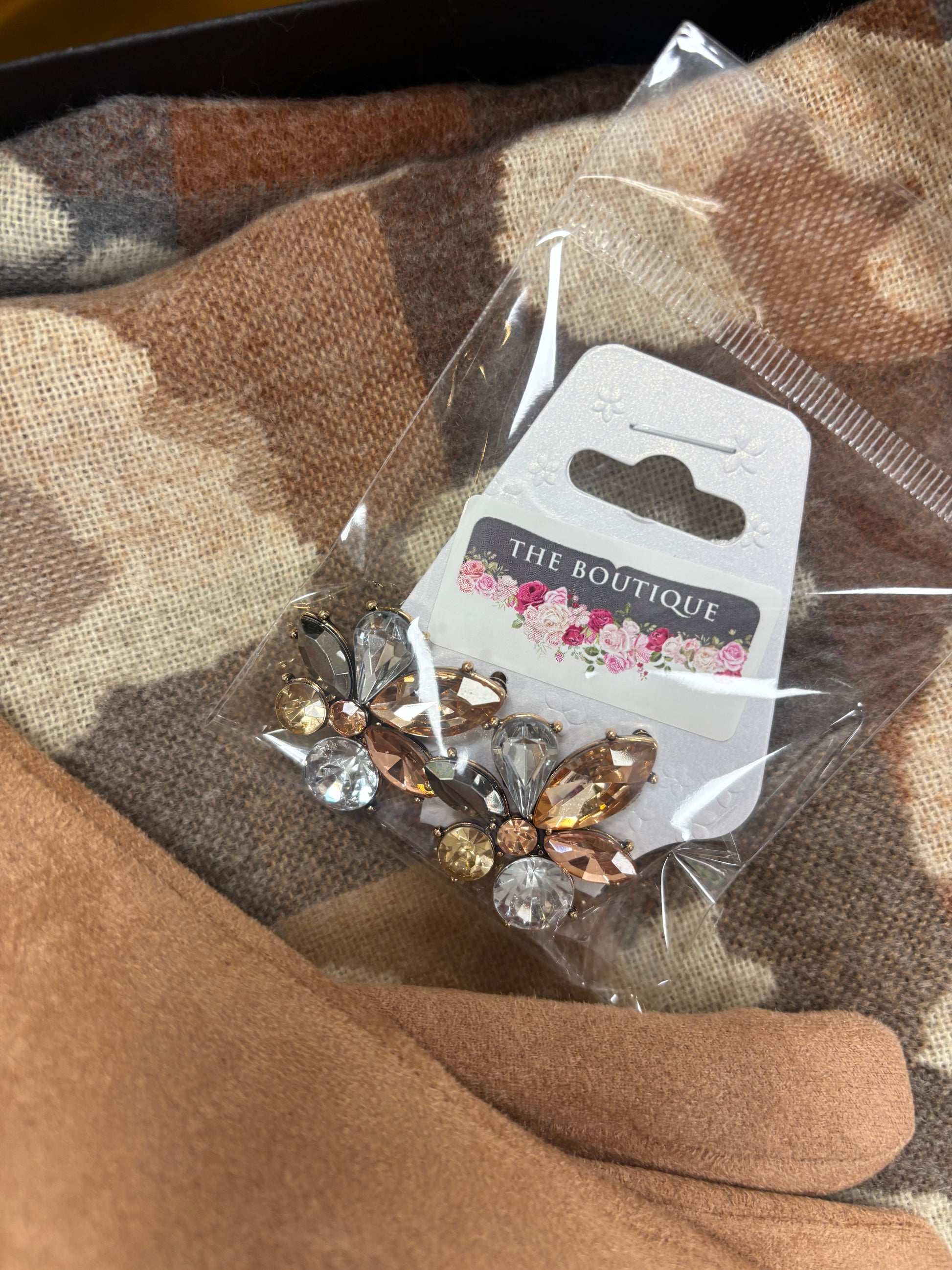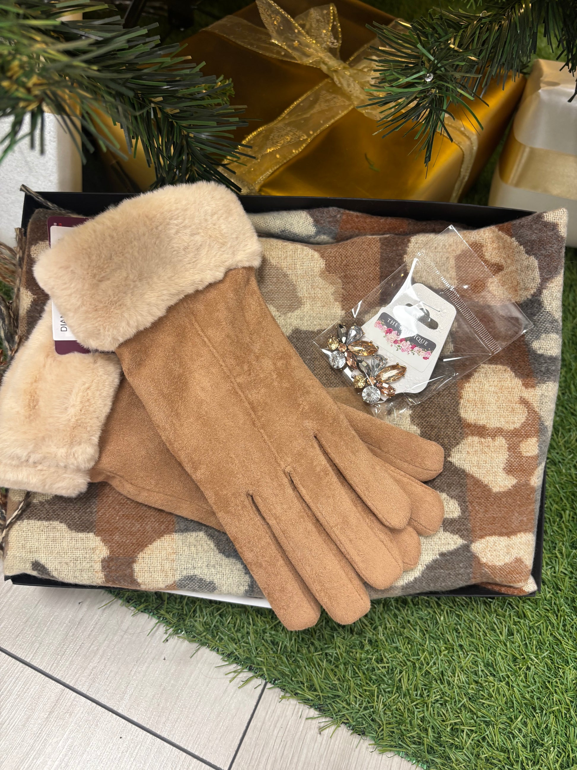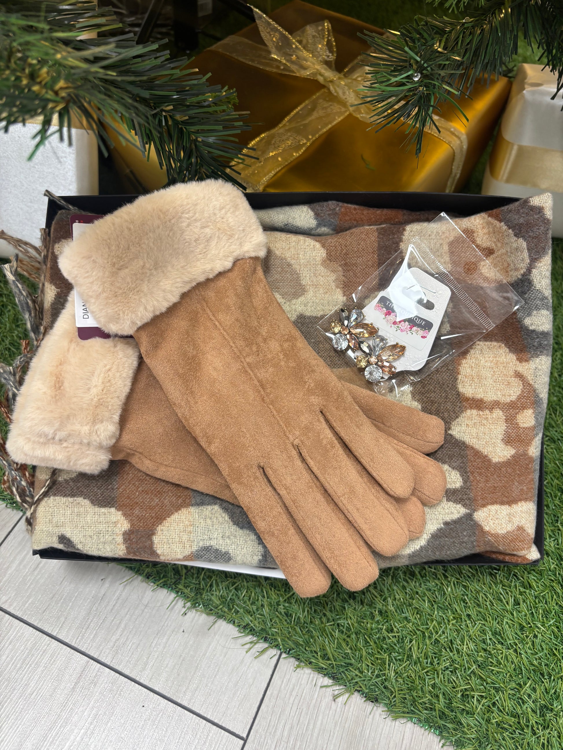 Coordinated grey and camel scarf and glove ensemble designed for seamless seasonal styling. This matching set combines practical warmth with polished sophistication, offering a refined approach to layering essentials.