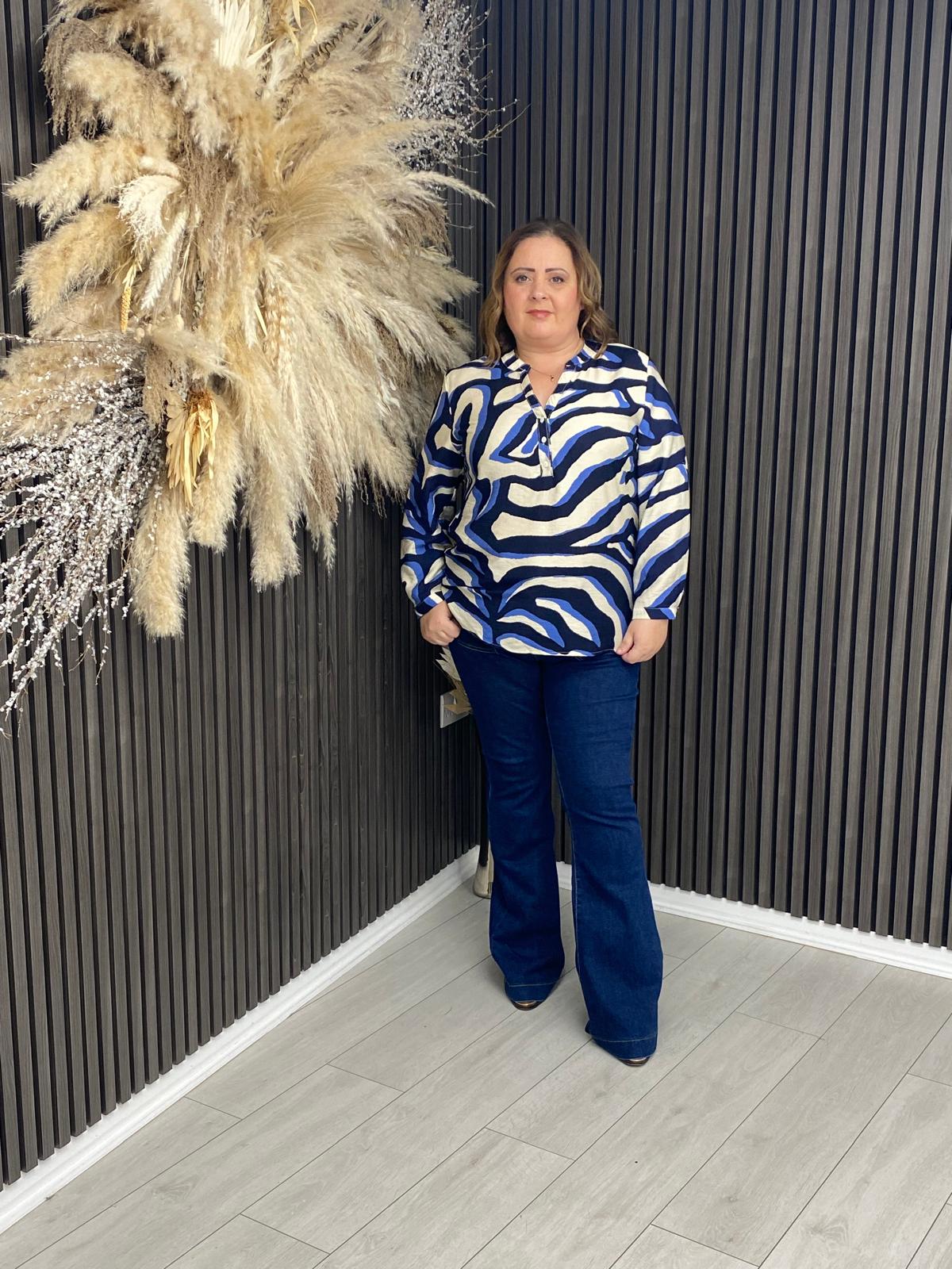 This V-neck top features a sophisticated blend of Blue, Navy and cream hues.