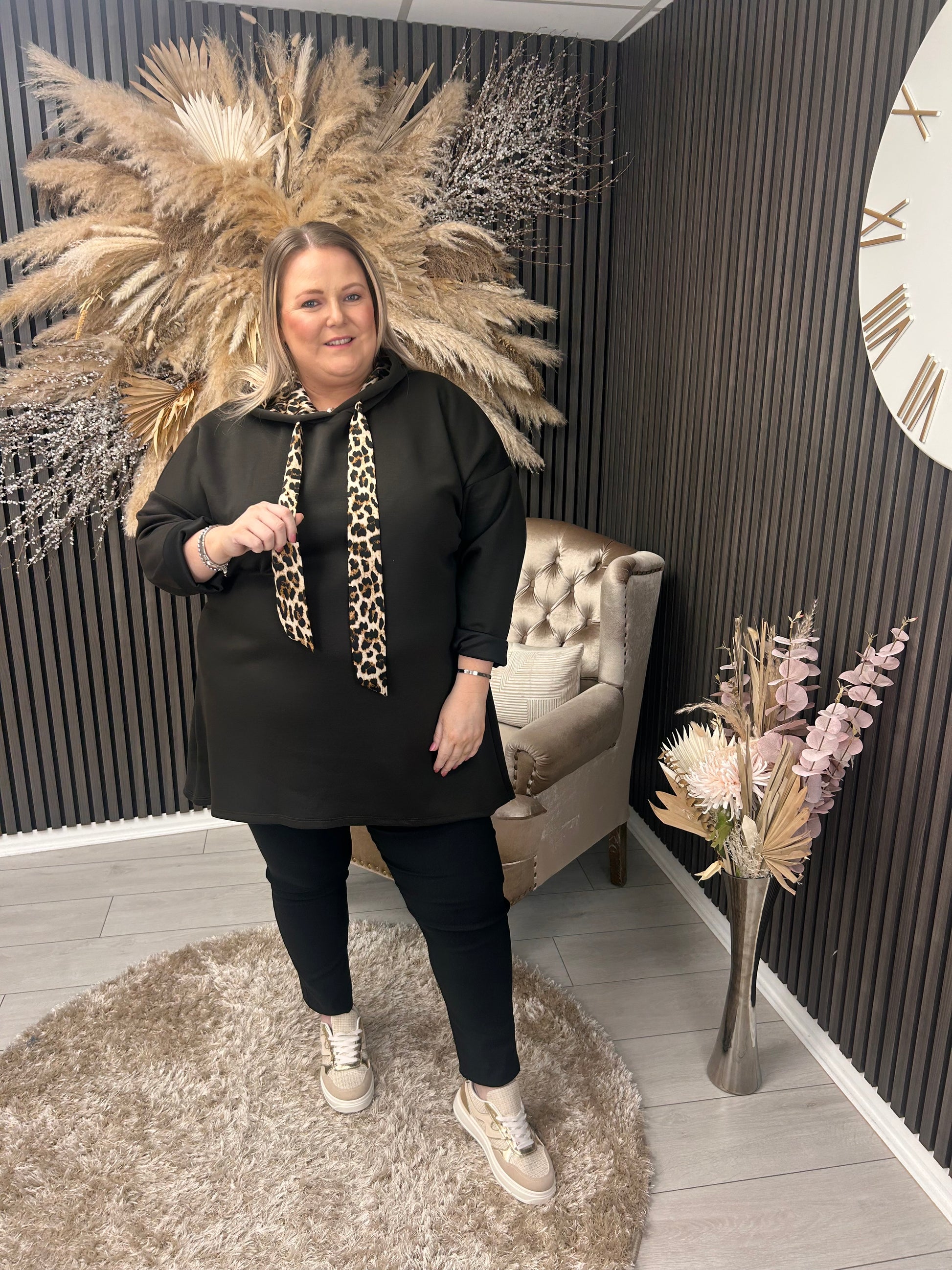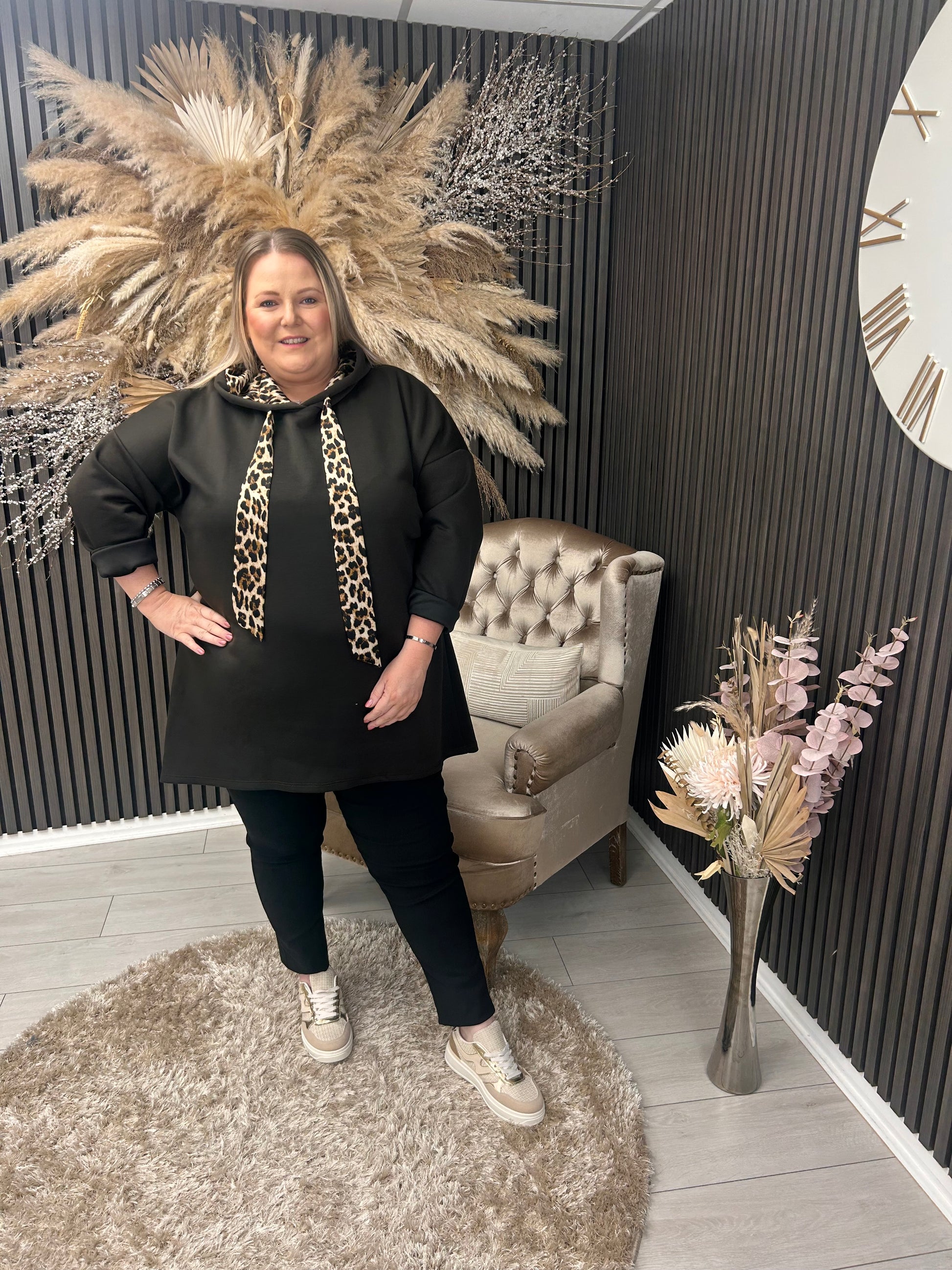 This brown-coloured hoodie features a distinct animal print lining inside the hood and is equipped with a matching tie for a tailored fit.
