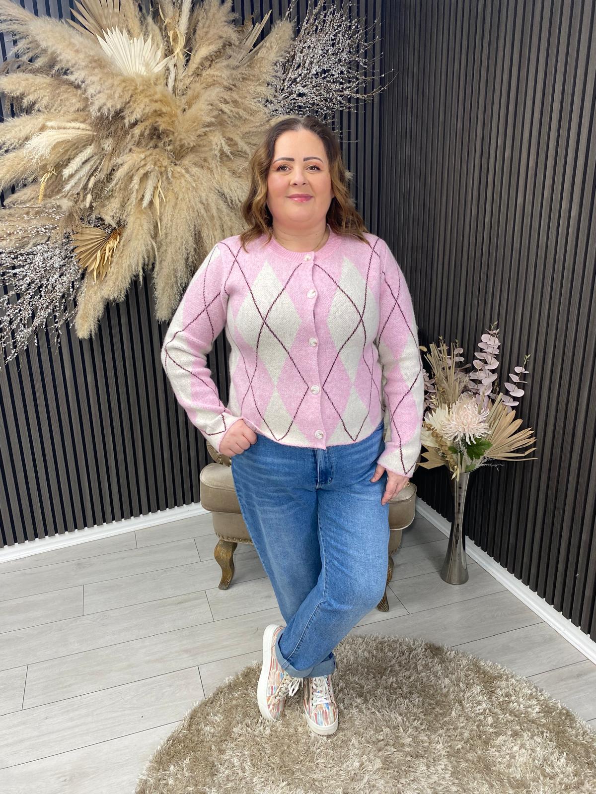 One-size button-front cardigan showcasing a sophisticated Pink and beige diamond pattern. A refined layering essential that seamlessly transitions between seasons, offering timeless appeal with contemporary geometric detailing for the discerning wardrobe.