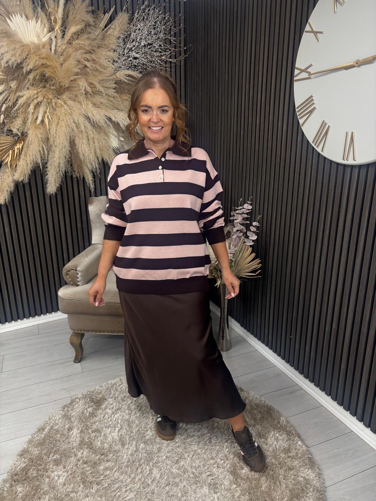 A sophisticated striped knit featuring alternating pink and brown tones, finished with a refined collar and button-front neckline. This versatile piece combines classic styling with contemporary colour blocking for effortless layering and everyday wear.