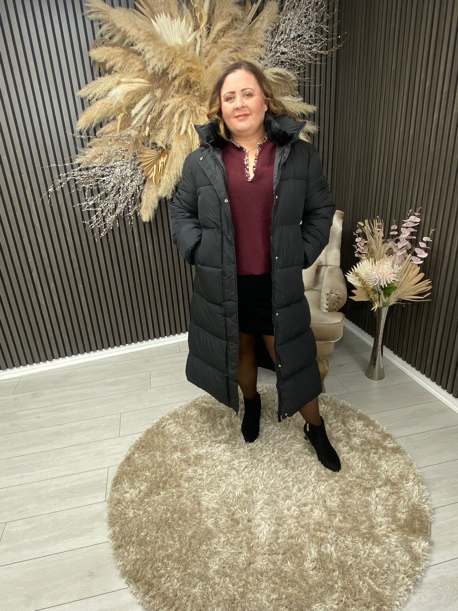 Sophisticated black padded coat featuring an extended silhouette and protective hood. This versatile layering piece combines contemporary design with practical warmth, ideal for transitional seasons and everyday wear.