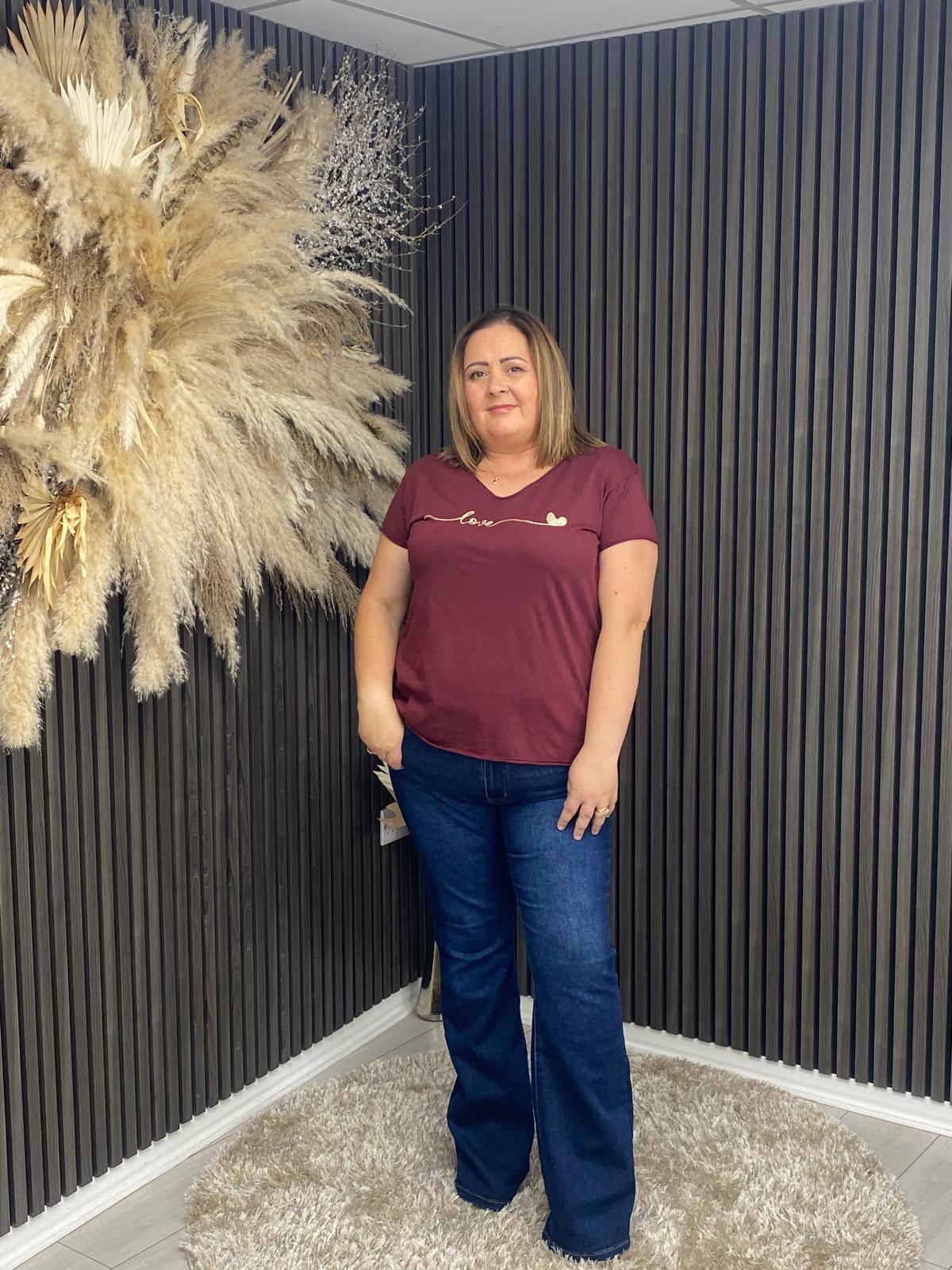 This V-neck t-shirt features elegant gold "love" lettering, combining simplicity with a refined touch.